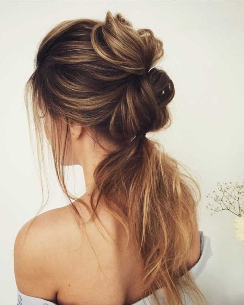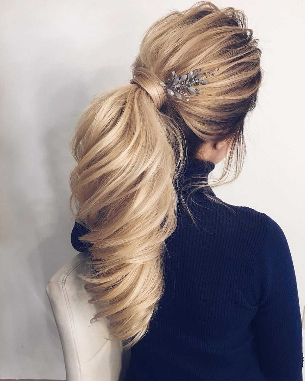 Если вам нравятся объемные укладки, обратите на такой вариант с начесом. На фото уроке видно, что сначала волосы необходимо слегка накрутить плойкой, затем нанести средство для укладки, сделать начес и собрать волосы сзади, закрепив невидимкой или тонкой резинкой.