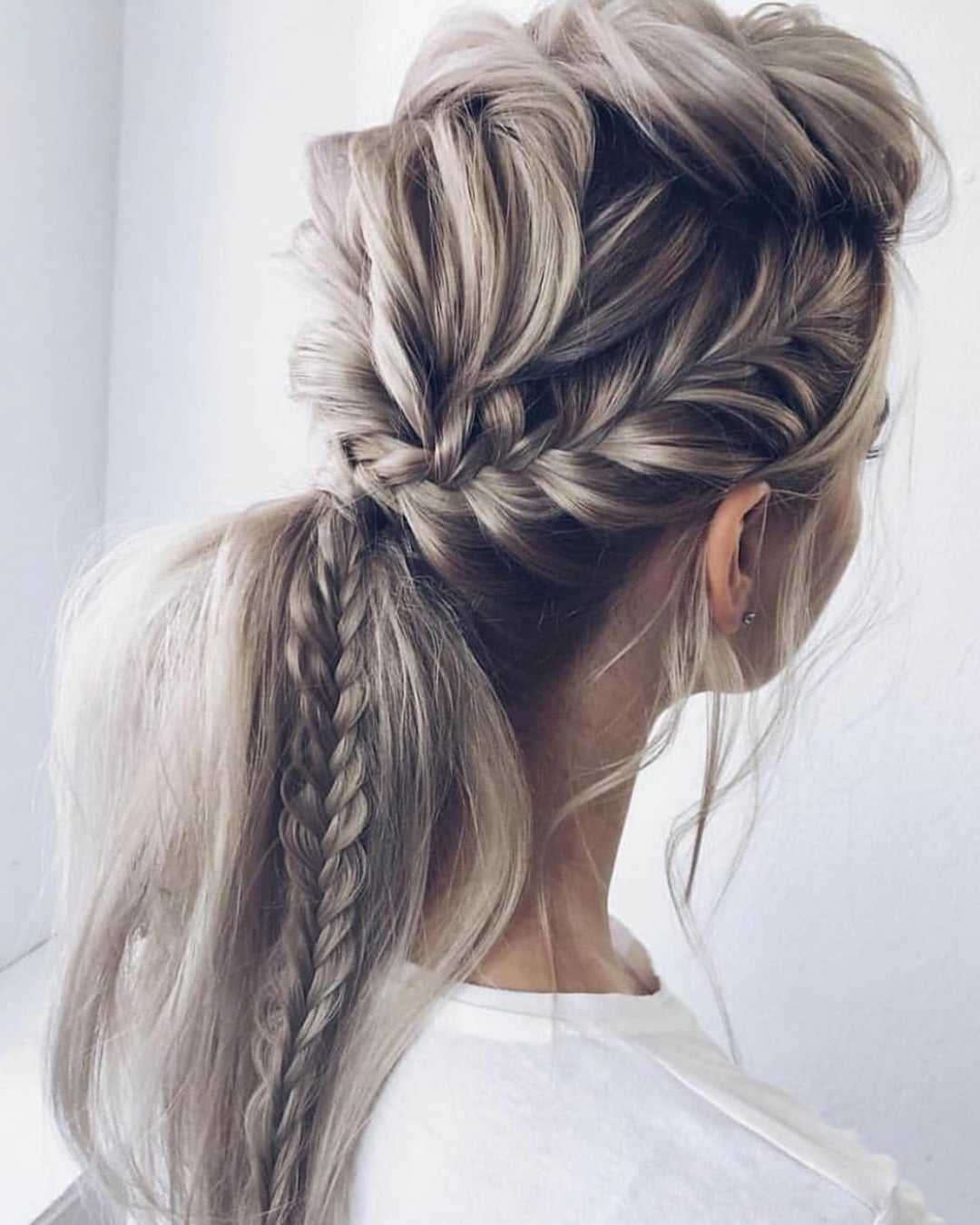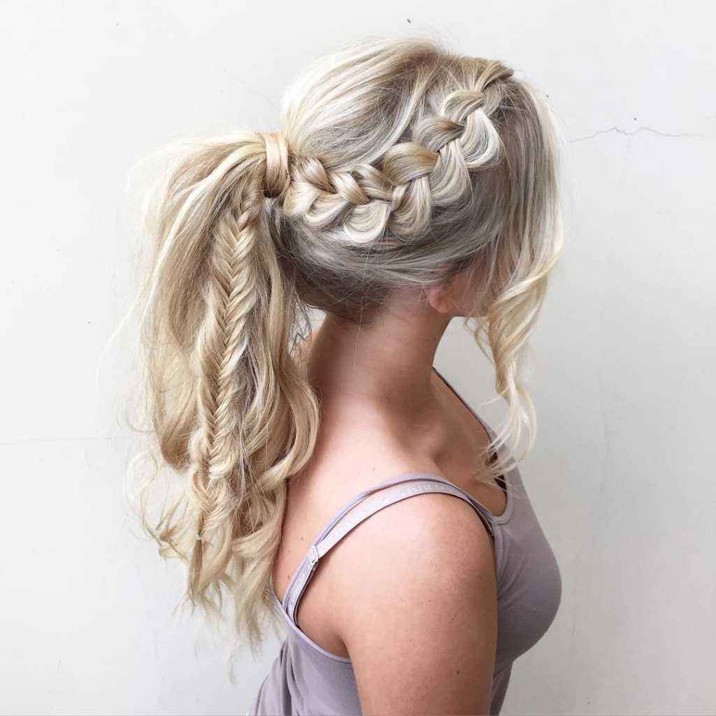 Вечерние прически могут быть более замысловатыми, чем повседневные. В них часто используется рыбий хвост. Косы могут плестись по окружности, горизонтально либо вертикально, зигзагообразно, по диагонали. Очень красиво в вечерней укладке смотрится коса «водопад». Можно плести ее лишь до середины, затем закрепить пряди резинкой и приколоть косу к волосам с помощью красивой заколки.