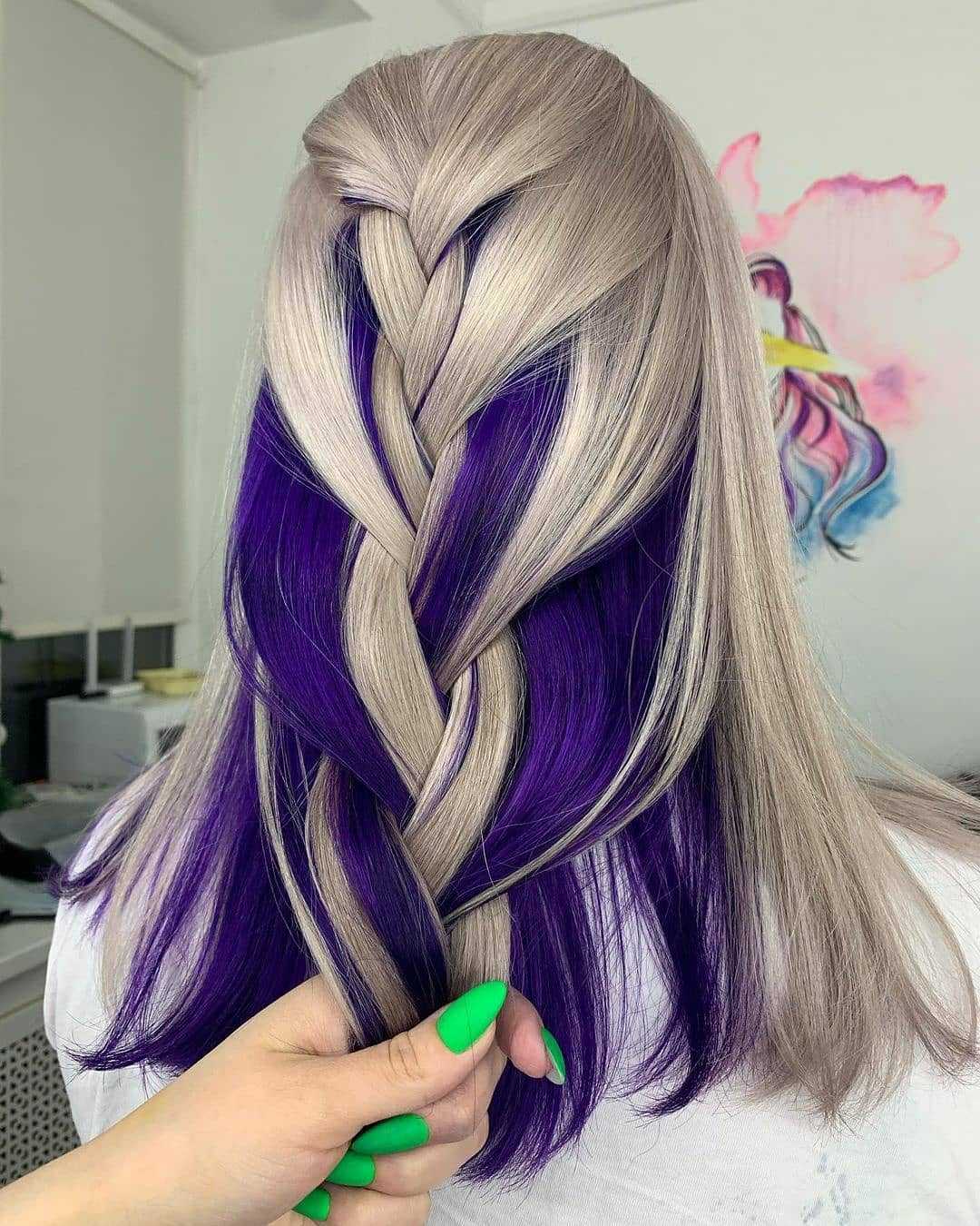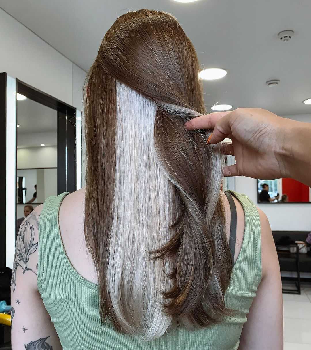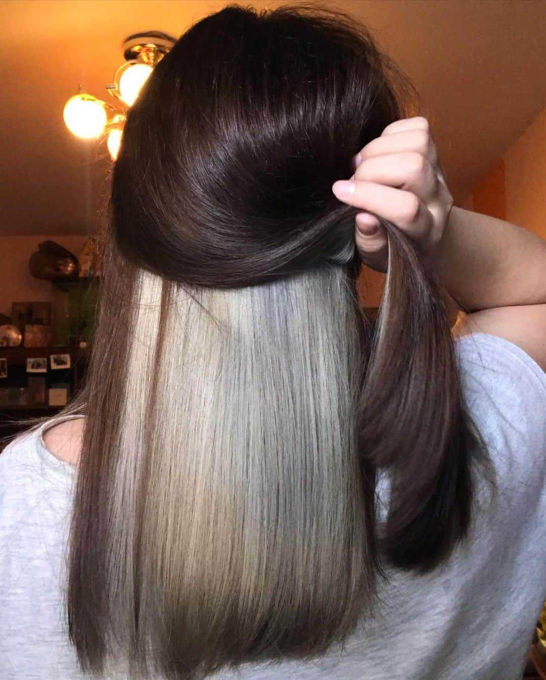 Необычное решение – скрытое окрашивание белым под волосами. При определенном проборе или поднятии волос будут видны светлые пряди.
