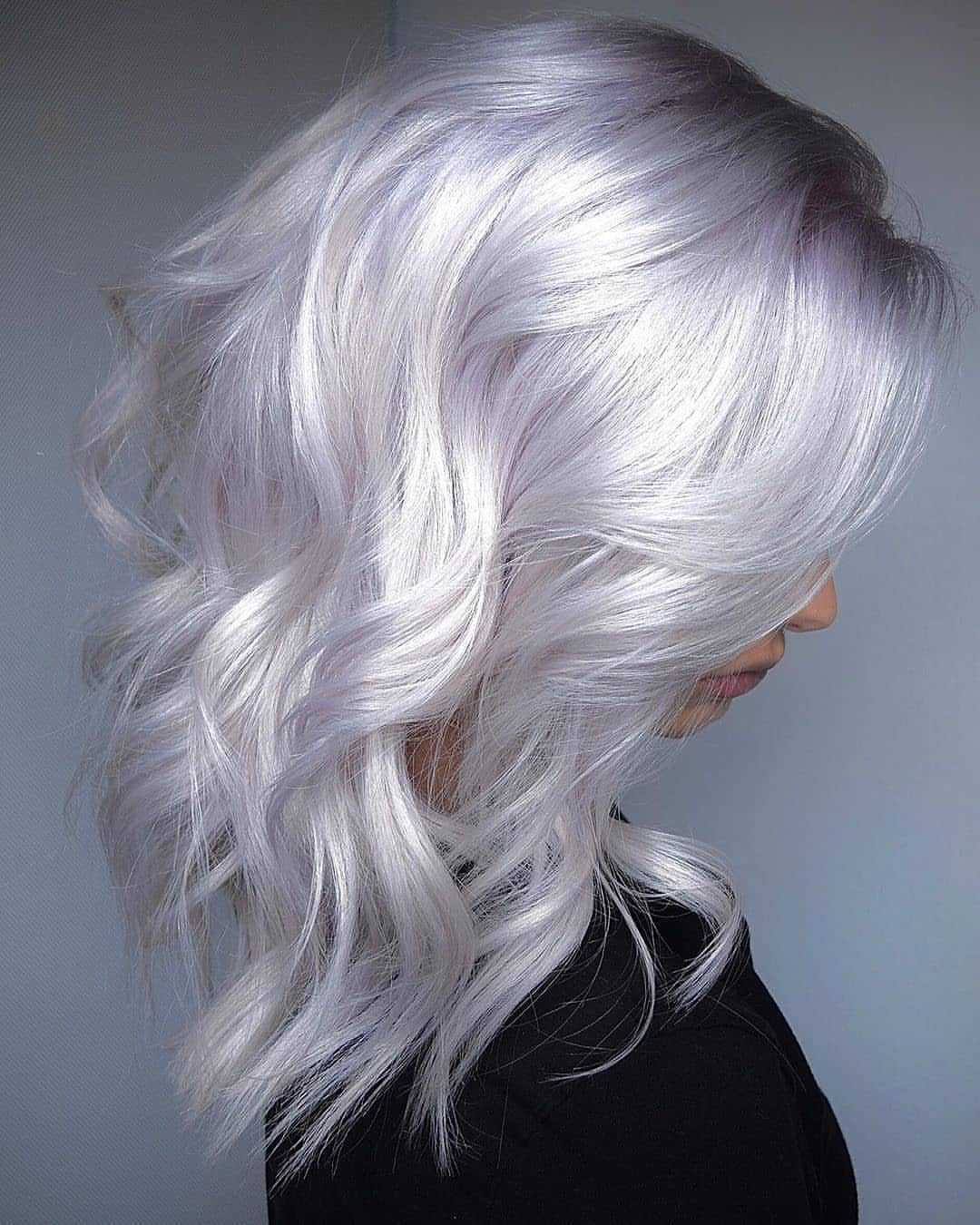 Перламутровый или жемчужный цвет волос нередко выглядит, как натуральный блонд за счет своей неброскости и того, как нежно он переливается на солнце. Этот оттенок довольно светлый и такой же холодный, как предыдущие, поэтому требует тщательного ухода.