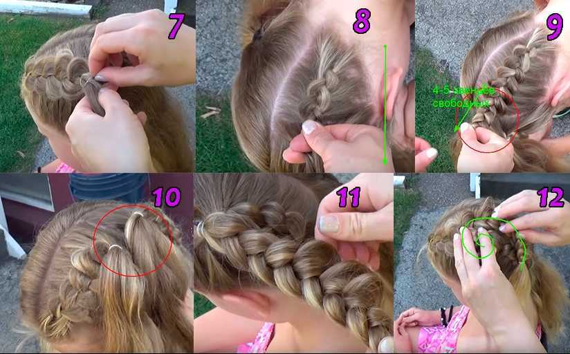 - Следите за тем, чтобы окончания кос легко соединялись резинкой. Заплетите из общего хвоста косу и заверните ее улиткой, как на 10 фото.