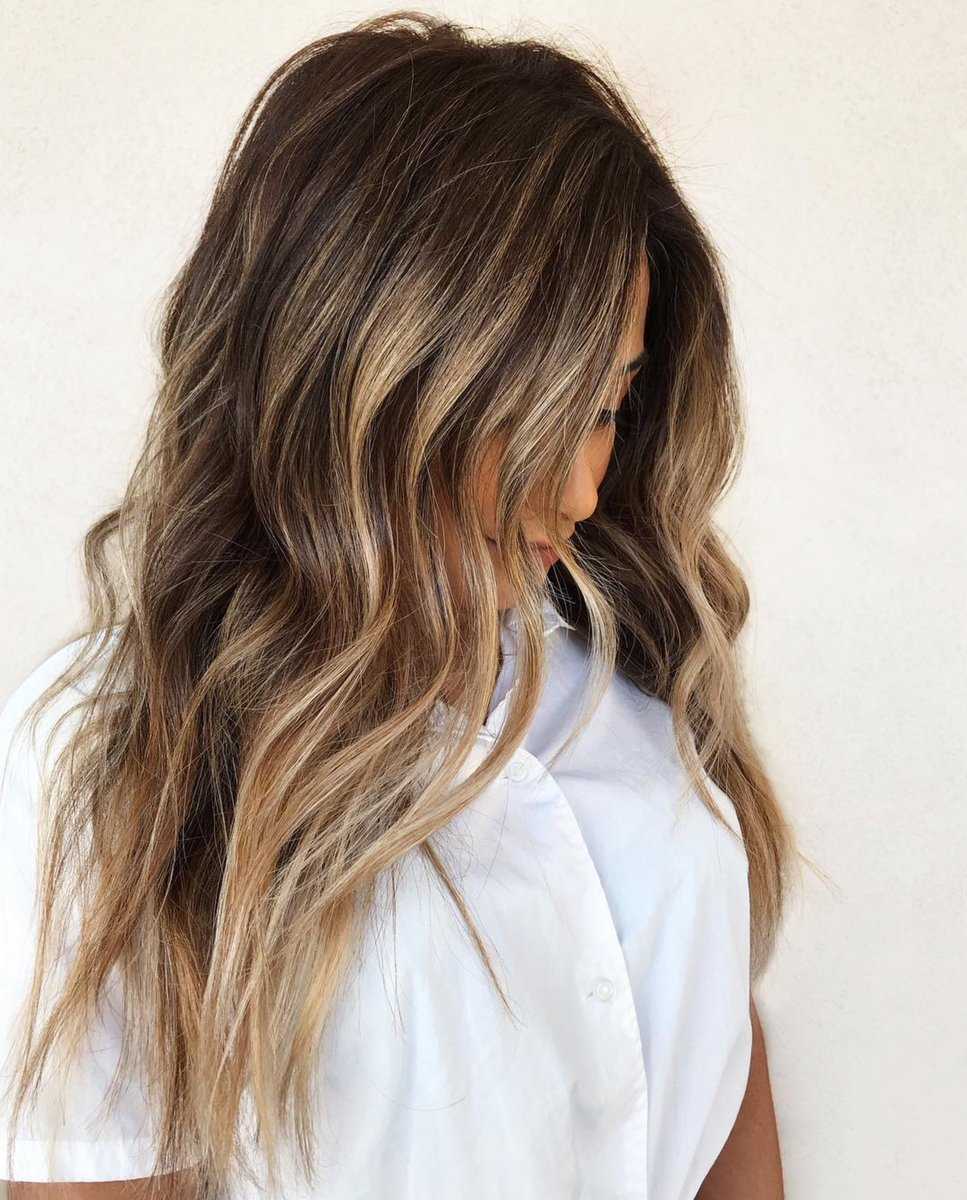 Локоны выглядят естественно, если их окрасить внизу на три тона светлее. Получается эдакий стиль выгоревших на солнце прядей. Прежде, чем осветлять концы, убедитесь что состояние ваших прядей удовлетворительное. Точнее они не пересушены и не ломкие, иначе рискуете остаться без кончиков волос, они просто будут ломаться и опадать.