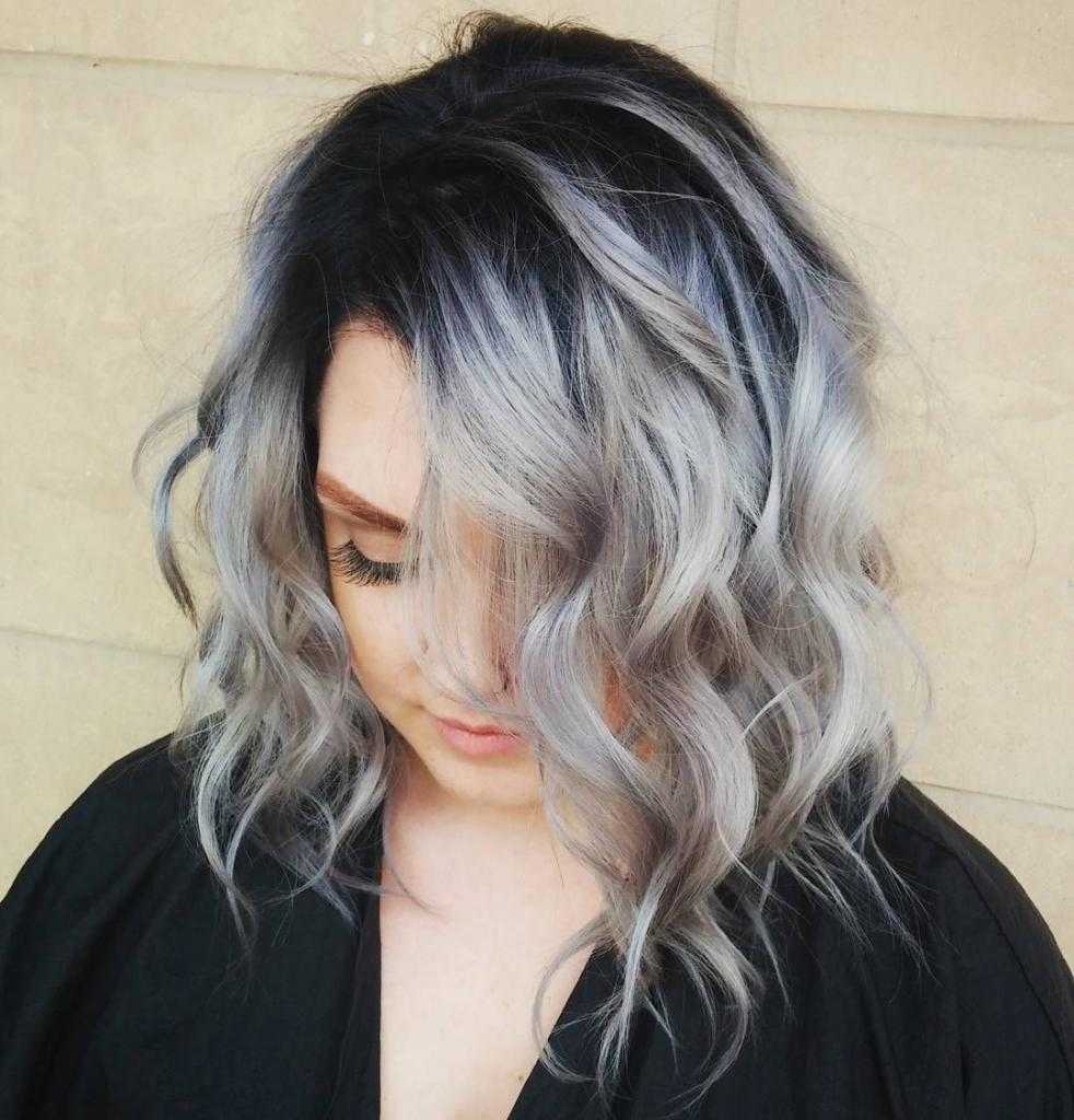 Контрастное серое. Девушки с темными локонами выбирают вариант, создавая переход в темно-серые, седые корни. Здесь разрешается добавить немного голубых или фиолетовых оттенков.