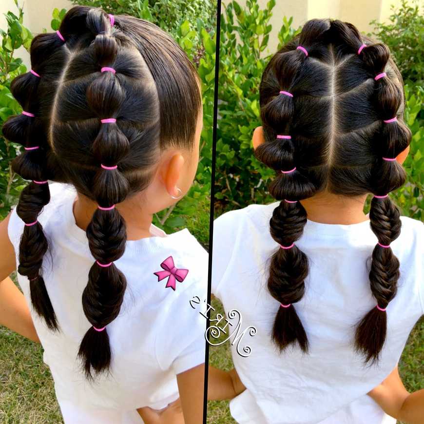 Не такой сложный вариант, как кажется. Начните с того, что убедитесь, что пряди гладкие, закреплены лентой. Затем разделит, создав верхний и нижний хвостик. В верхний поместите дополнительную резинку примерно на 3-4 см от предыдущей. Разделите пополам, сделав отверстие для нижнего хвоста, чтобы потянуть его снизу вверх. Повторите этот процесс до конца длины хвоста или остановитесь у основания черепа. Это одна из милых причесок, которую достаточно легко сделать утром перед школой.
