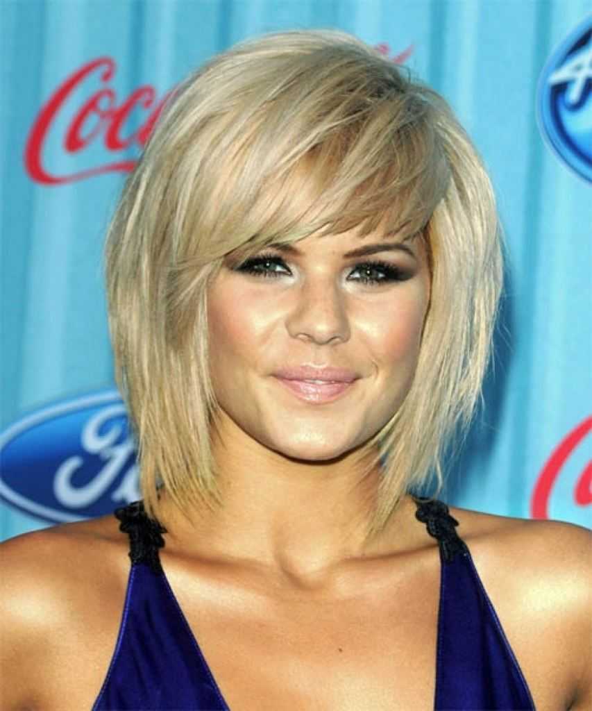 Стилисты рекомендуют: боб с легкой градуировкой, косую челку которая «режет» округлость лица, удлиненное каре длиною до груди, асимметричную форму.