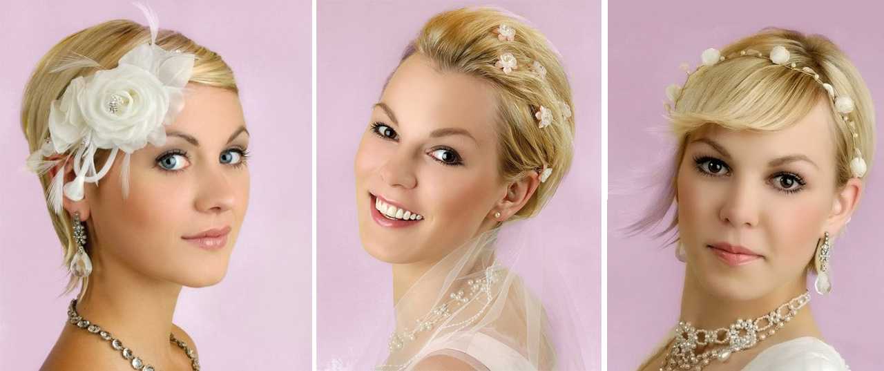 Парикмахеры рекомендуют для коротких волос выбирать максимально простые и лаконичные прически, которые неплохо будет дополнить различными украшениями. Можно сделать как небрежные волны, так и просто выпрямить волос, используя венки, живые цветы, диадемы и так далее.
