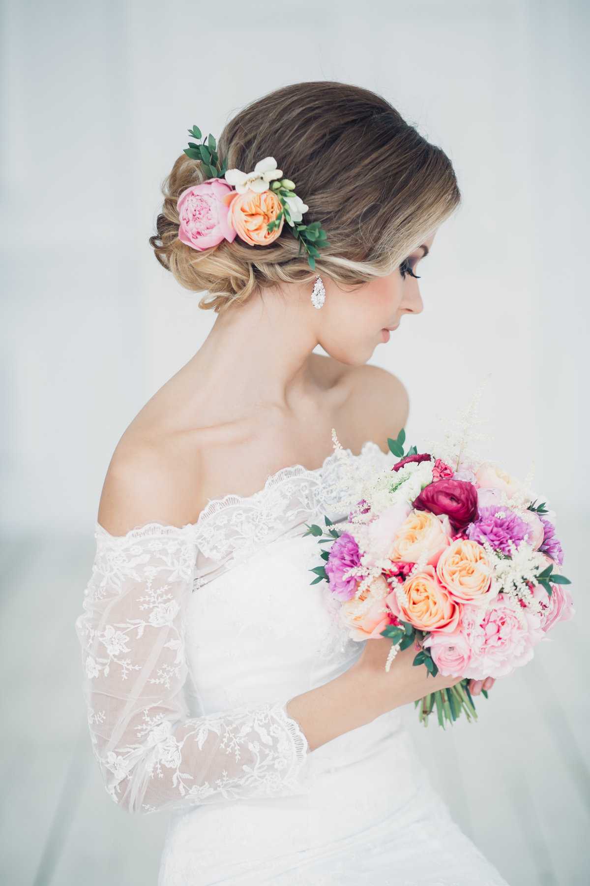 Например, нежных цветов – как искусственных, так и настоящих. Венок, отдельные бутоны, небольшая композиция, перекликающаяся с букетом невесты – всё это добавит в образ нотки нежности и женственности. Цветы готовы выполнять и практическую функцию: маскировать заколки, гребни, ленты, необходимые для создания формы, или же выступать с ними в изящном ансамбле, дополняя друг друга.