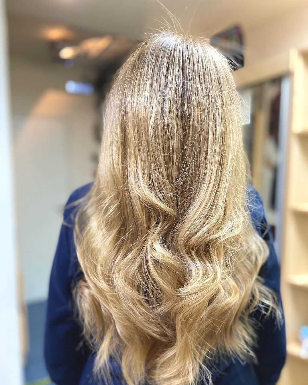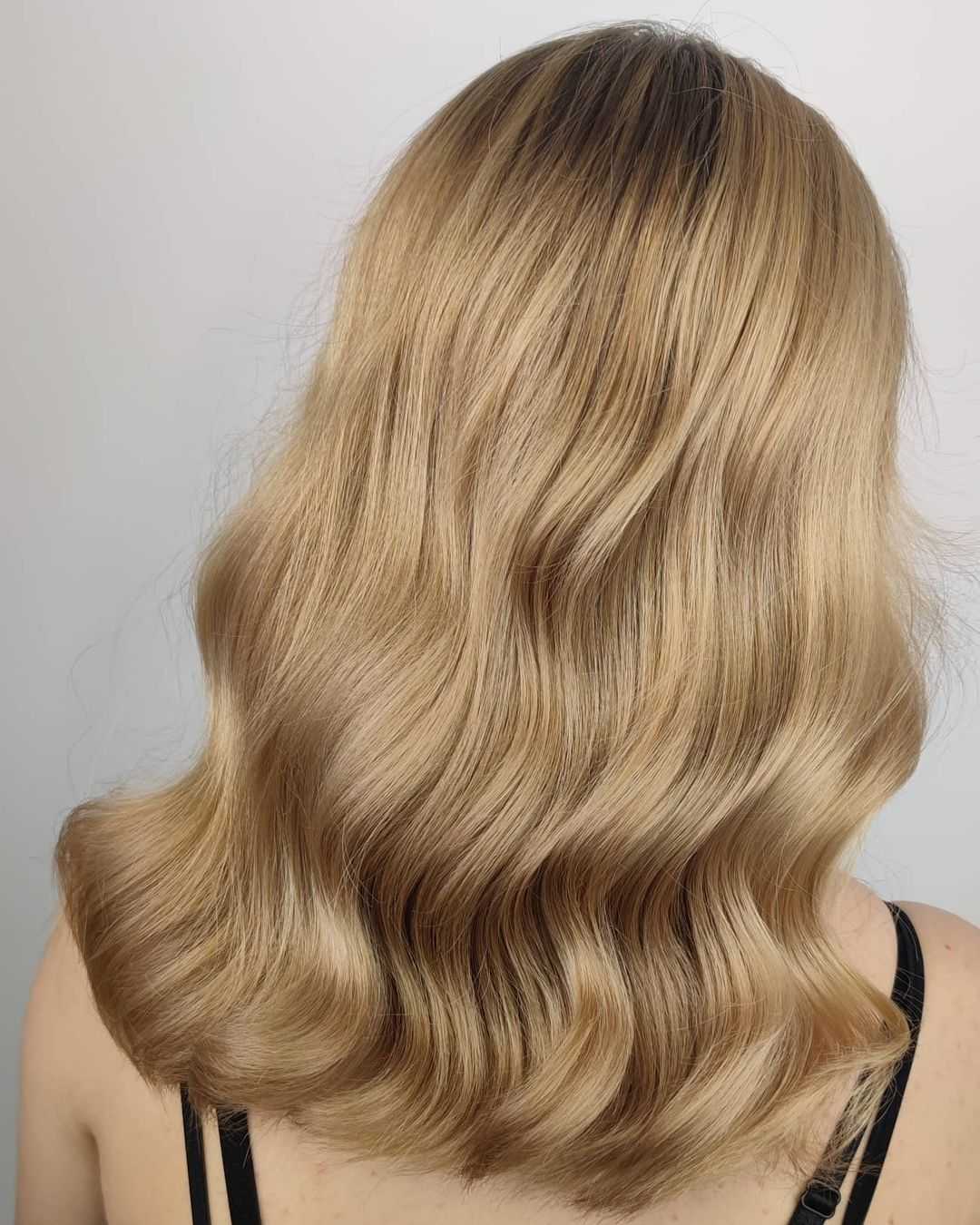 - Блонд в медовых и золотистых тонах — это многомерный оттенок, который лучше всего подходит для длинных или средних волос.