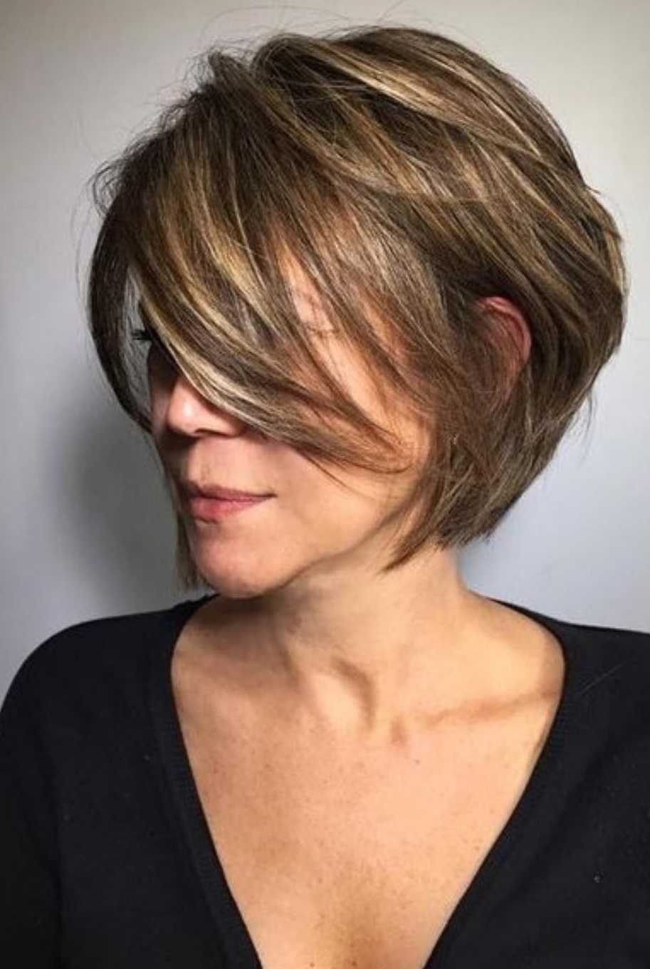 косой пробор — отличный способ скрыть любые дефекты, в том числе диспропорции лица, основной объем с помощью мусса или пенки делается на макушке, удлиненные срезы необходимо выровнять, направление зависит от настроения, завернуть концы можно как во внутрь, так и наружу;