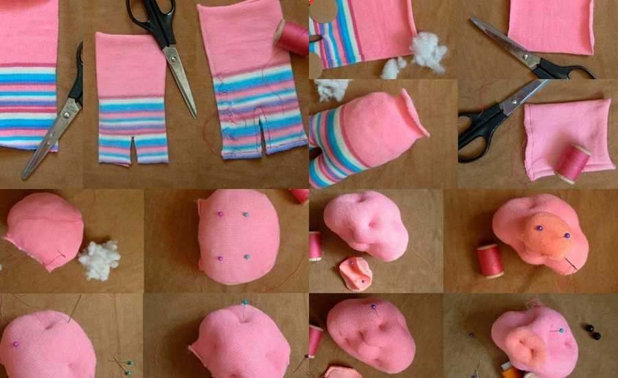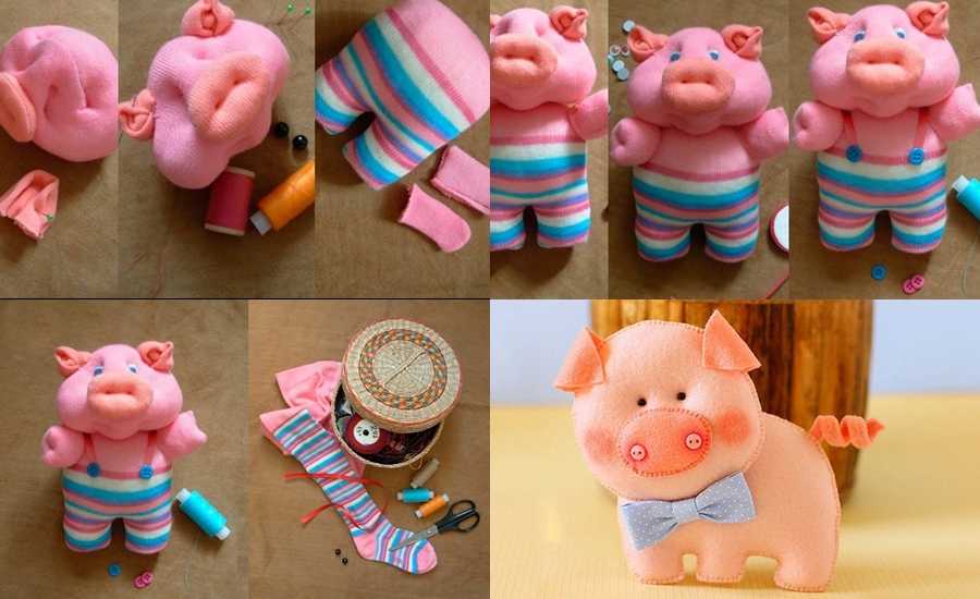 Отдельно стоит отметить создание символической игрушки своими руками – поросенка Наф-Наф. Для того, чтобы получилась милая свинка, потребуются носки, нитки, ножницы, бусины и пуговицы для глаз и пятачка, а также вата для наполнения. Мастер-класс с пошаговой инструкцией показан на фото ниже.