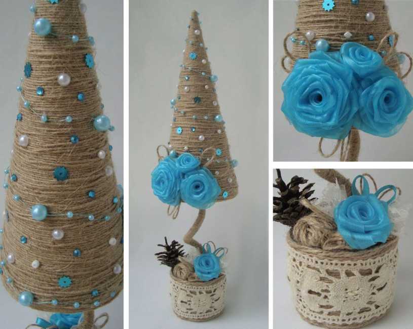 - Из плотного картона вырежьте силуэт ёлки (самый простой, в форме треугольника). Смажьте его клеем, а затем аккуратно обмотайте всю поверхность игрушки бечёвкой. Украсьте поделку небольшим количеством бусин нейтральных светлых оттенков. Не забудьте про петельку.