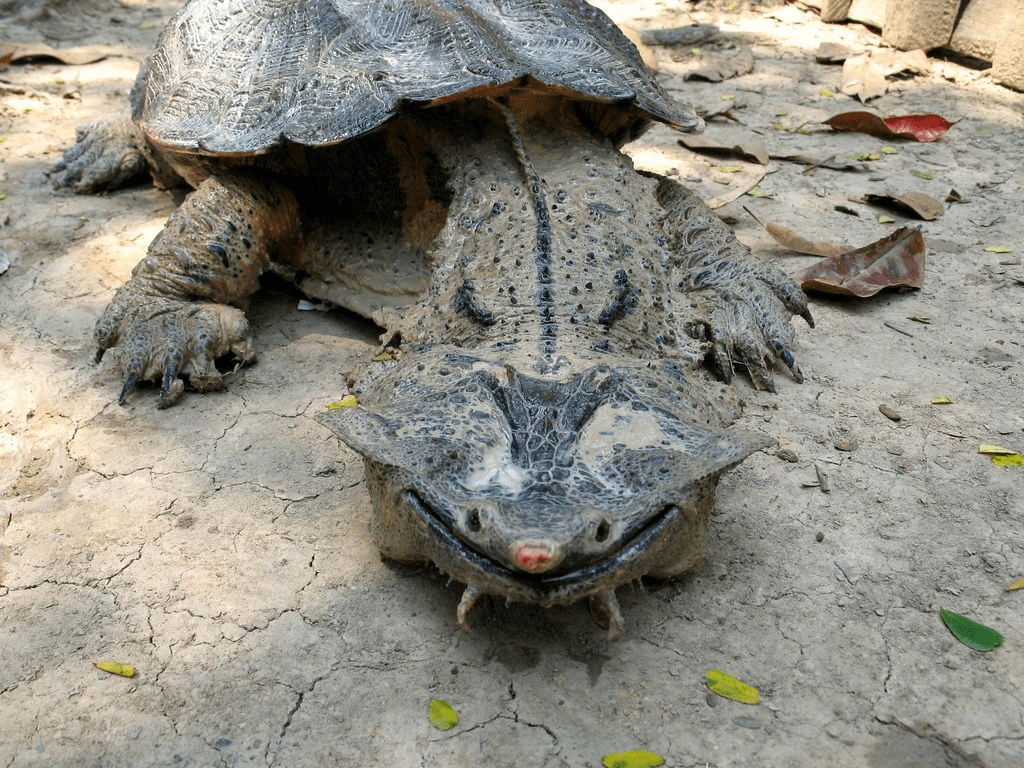 Необычна и мордочка этого пресмыкающегося: вместо стандартного носа у рептилии виден небольшой хоботок, который удобно выставлять на поверхность из воды, чтобы вдохнуть немного воздуха. Рот этой черепахи выполняет одну нестандартную функцию: через него происходит мочеиспускание. Это необходимо животному для того, чтобы регулировать уровень жидкости в организме при погружении на глубину.