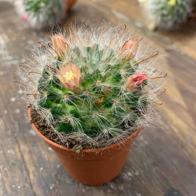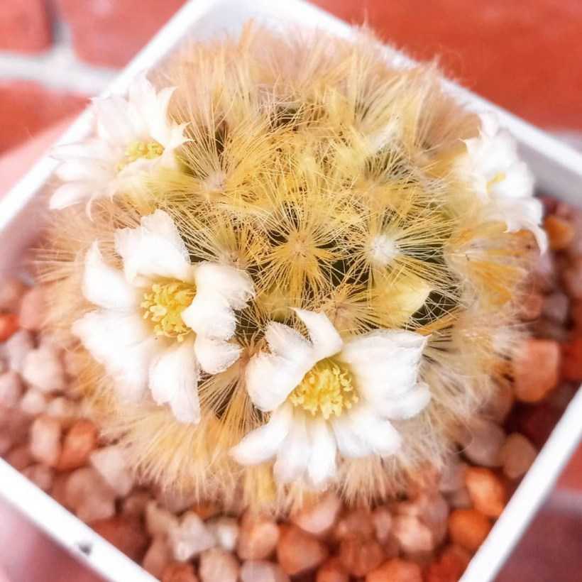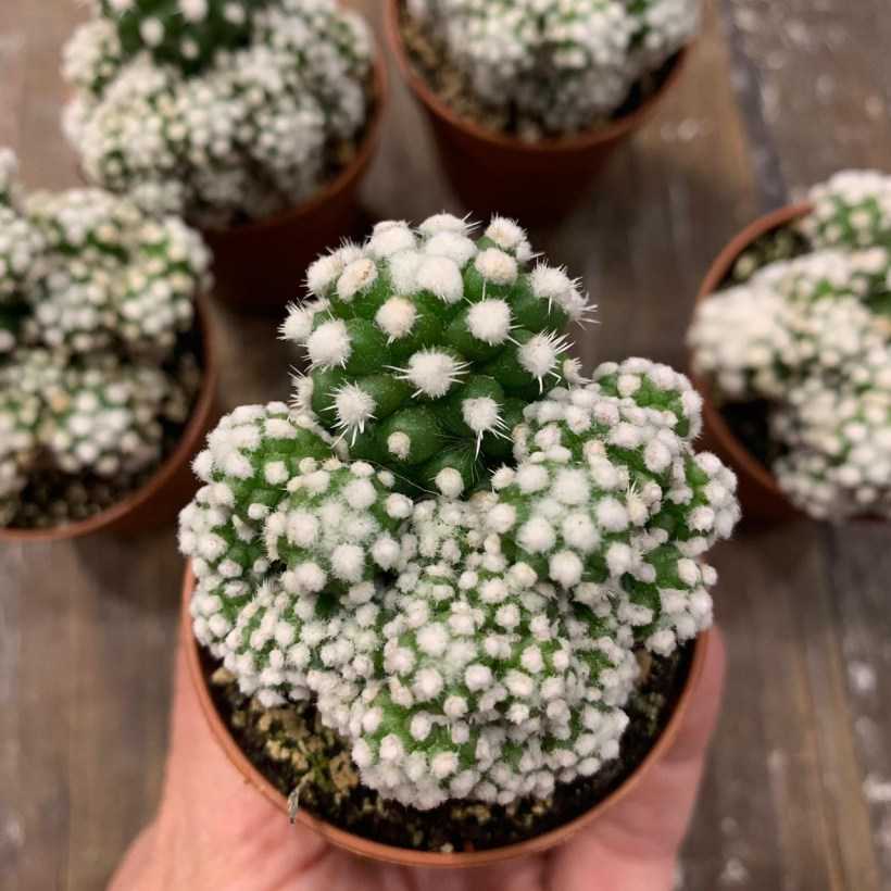 Такие комнатные кактусы встречаются практически у каждого любителя домашних цветов. Форма кроны шаровидная. Окрашена в изумрудный цвет, присутствуют пепельные оттенки. Высота кустика обычно не более 26 сантиметров. Отличием от других видов кактусов является присутствие белых тоненьких нитей, которые расположены между длинными колючками.