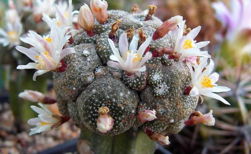 Лофофора – кактус необычного внешнего вида, похож на тыкву, имеет гладкую поверхность без колючек.