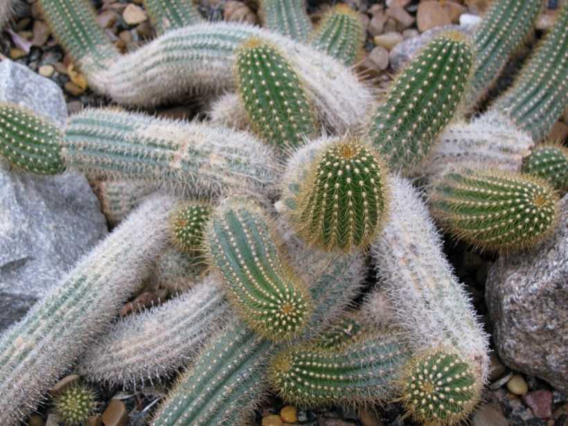 Клейстокактусы – имеют цилиндрические прямостоячие высокие стебли, густо покрытые белыми или светло-желтыми колючками, цветы распускаются на самых верхушках.