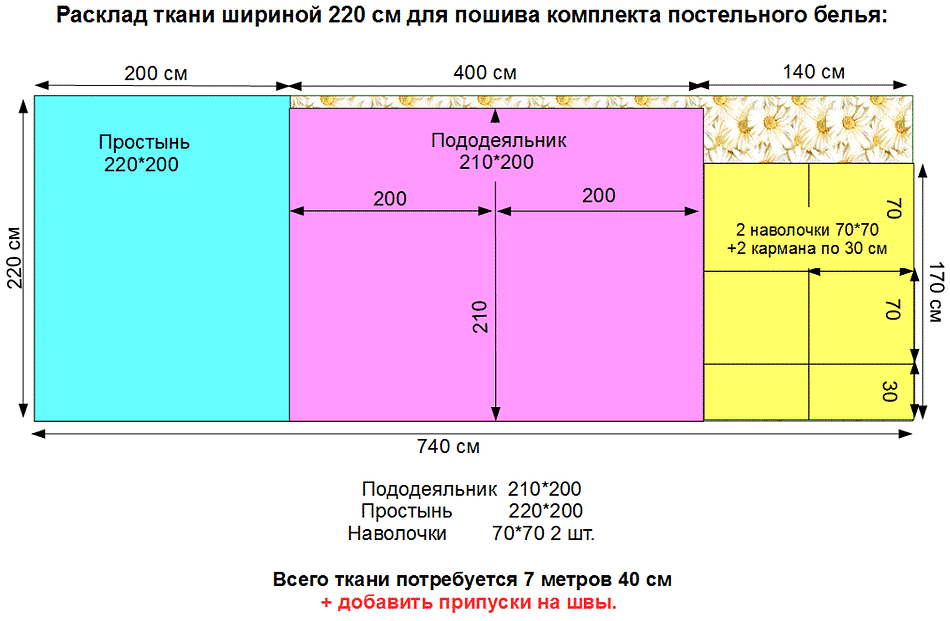 - Для пошива простыни понадобится ткань 120 сантиметров.