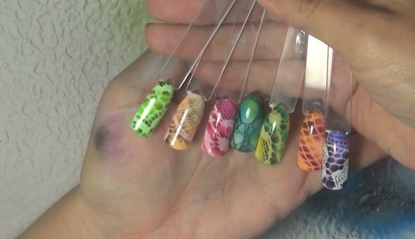 Для создания более замысловатого и сложного рисунка можно использовать несколько трафаретов, дополнять дизайн блесками или стразами. Если нет в наличии специальных наклеек, подойдет любая кружевная ткань или сетка. Можно сделать маникюр, используя лишь плавные переходы различных цветов.