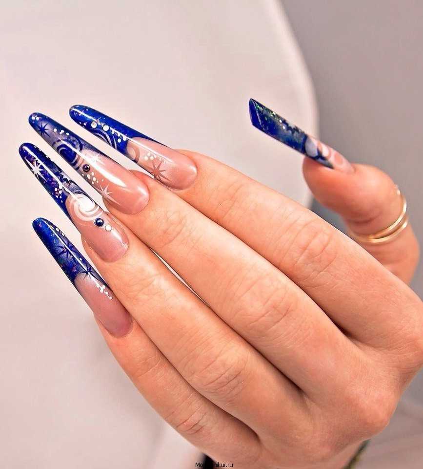 - Для начала проделайте все стандартные манипуляции: хорошо отполируйте ногти, нанесите базовое покрытие, затем основной цвет, например, синий. Хорошо просушите каждый слой.