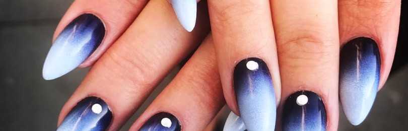 - После этого накапайте в аэрограф небольшое количество синей краски, и распыляйте ее на расстоянии пяти сантиметров от ногтевой пластины. Старайтесь сделать так, чтобы на краю ногтя краски оказалось больше, так вы получите красивый и ровный градиент.