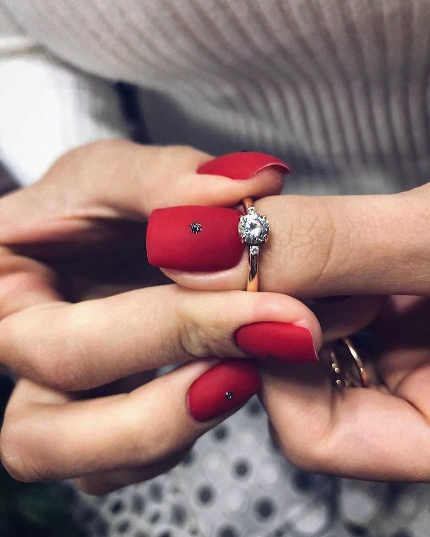 В повседневной жизни женщинам стоит присмотреться к матовому красному маникюру со стразами (на безымянных ногтях). Такой маникюр выберет целеустремленная, страстная и уверенная в себе натура.