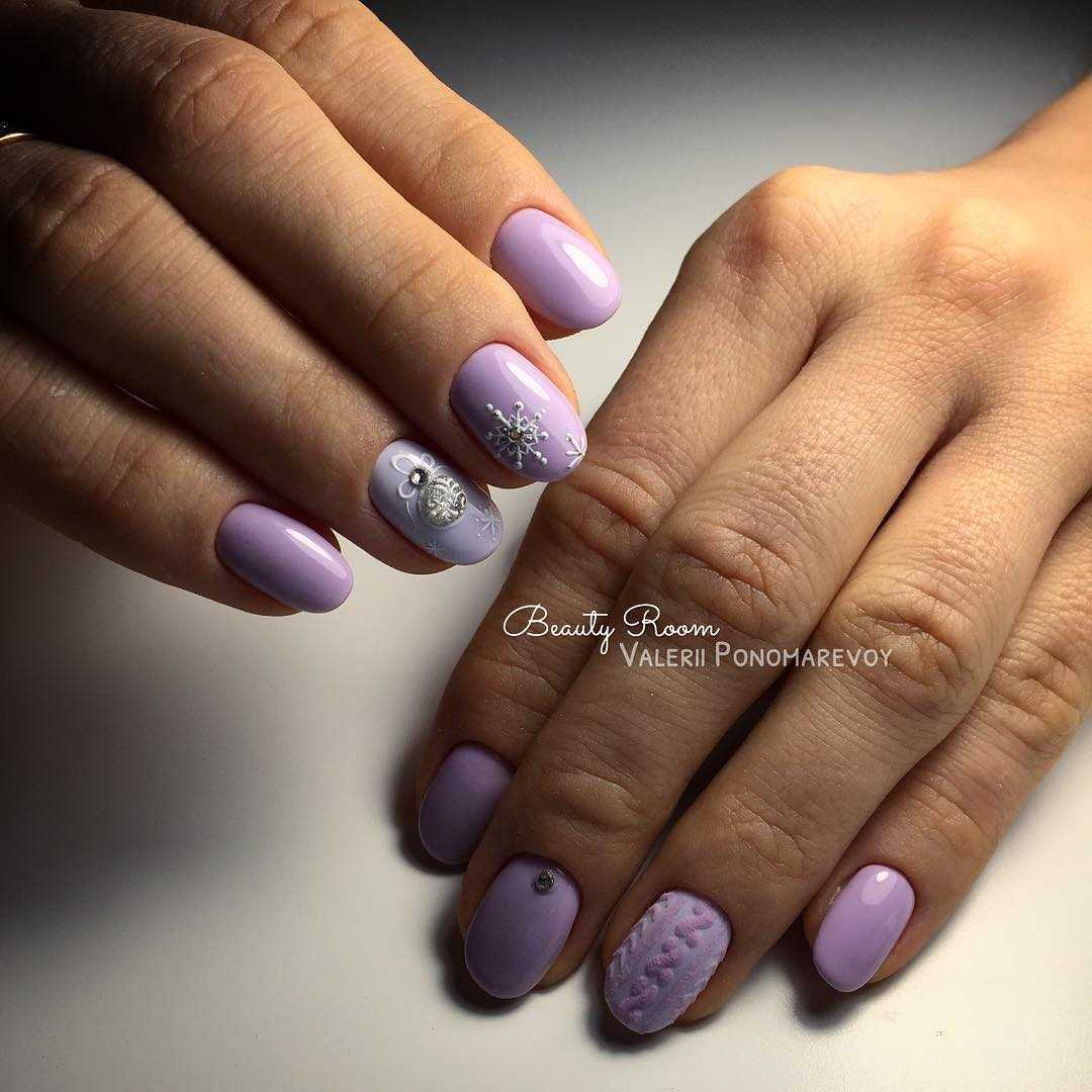Модным является черно-белый маникюр, сделанный при помощи матовых покрытий. При этом по два пальца на каждой руке оформляются градиентом, в остальные — покрывают однотонным черным тоном. Чтобы дизайн не получился слишком скучным, можно украсить его при помощи сверкающих декоративных камней, уложенных в виде снежинок.