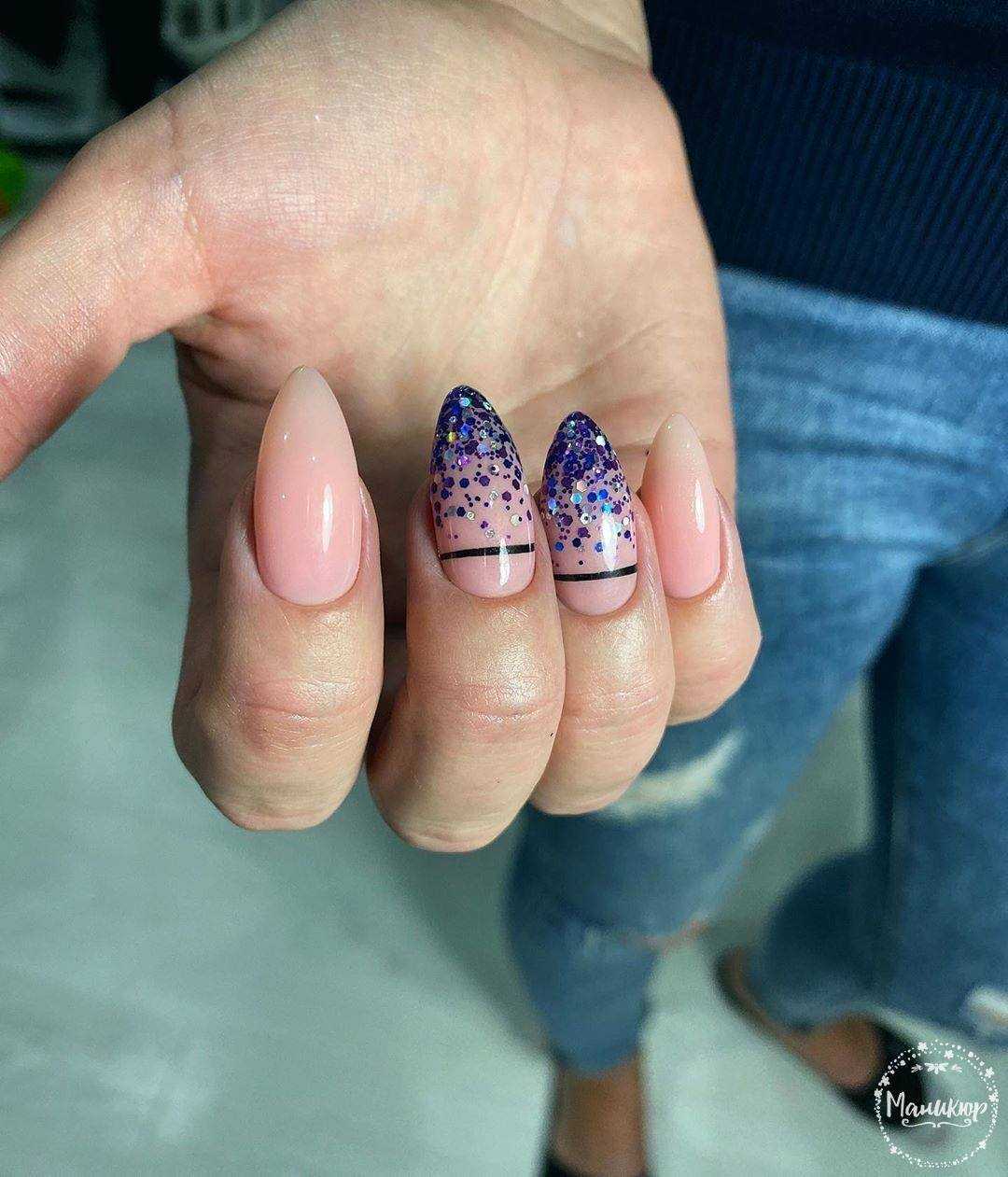 Еще одним модным вариантом блесток являются блестящие конфетти. По-другому их называют камифубуки. Их принято располагать у основания или в середине ногтевой пластины. На бежевом фоне можно использовать сразу несколько оттенков конфетти. При помощи этих декоративных элементов можно создать модный эффект градиента.