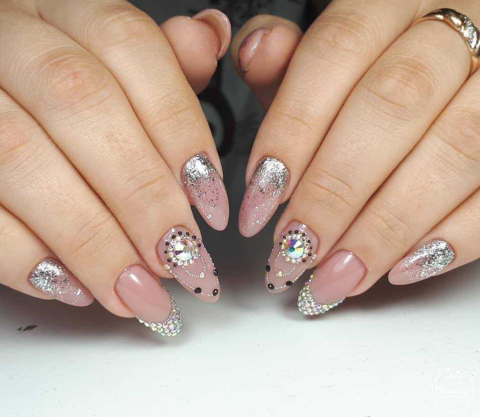 В качестве сопутствующего декора часто используются блестки, пайетки, бульонки. Такое сочетание помогает создать динамичный и эффектный дизайн ногтей, который не ограничивается только крупными стразами.