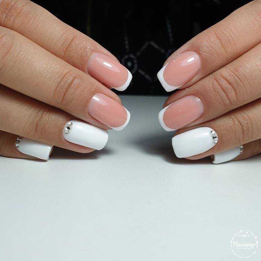 Если белый френч выполнен на любом другом светлом цвете , то безымянный палец можно заполнить полностью белым цветом и украсить его цветными стразами.