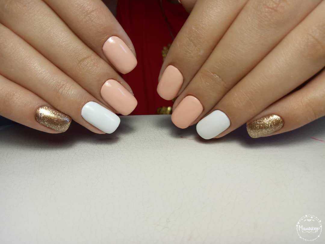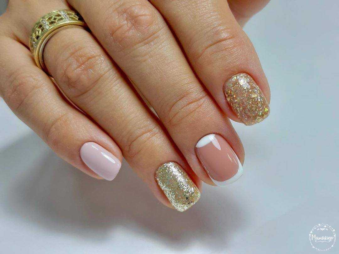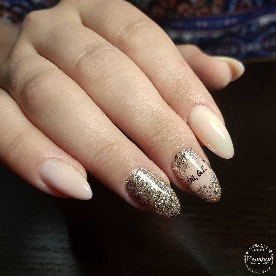 Такая идея оформления ноготков считается самой простой и популярной вариацией маникюра, которая, не смотря на свою лаконичность, удивительно преображается при помощи страз. В списке популярных монохромных вариантов можно отметить выделение блестящими материалами безымянного пальца, расположение несложных узоров на паре ноготков и сверкающие лунки у основания. Очень привлекательно смотрятся комбинированные вариации, в которых одна из пластин покрывается золотистым лаком или идеи маникюра с золотистыми узорами или рамками. В таких примерах более актуально использовать декор в тон блестящим дополнениям, что позволить максимально продемонстрировать изысканность бежевой палитры. Подобные идеи кардинально изменяют восприятие бежевого маникюра и являются стопроцентным подтверждением изысканного стиля своей обладательницы.