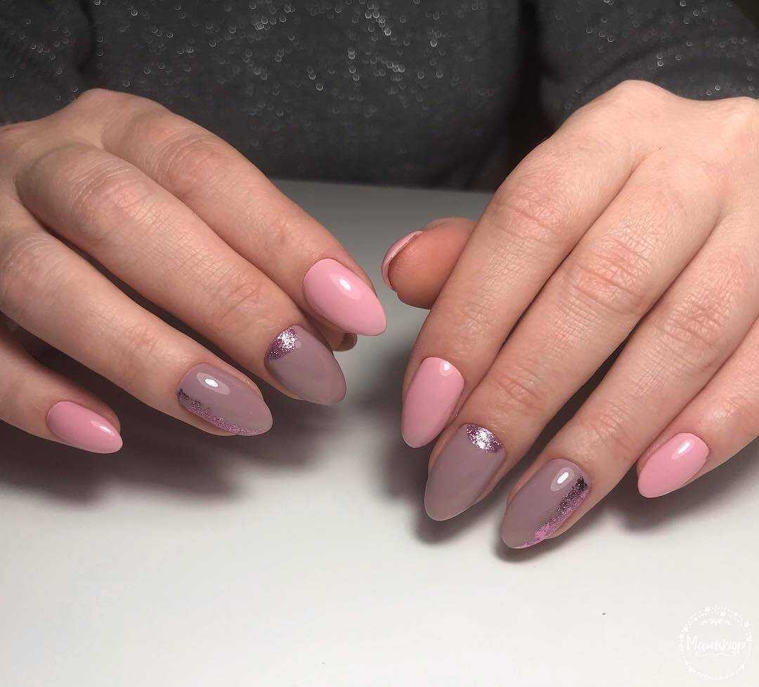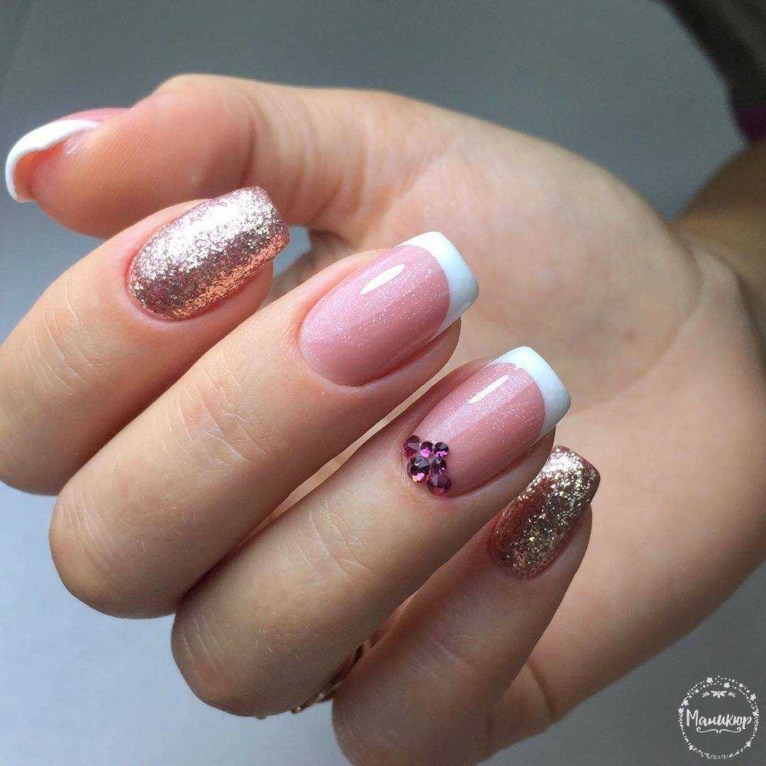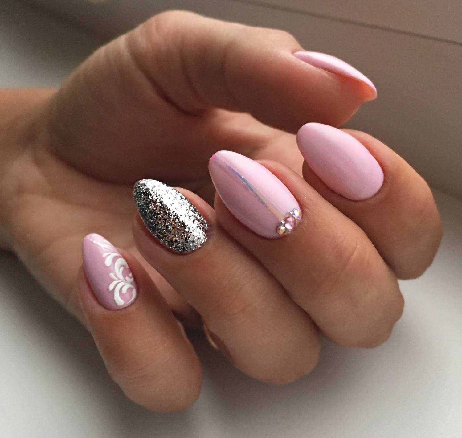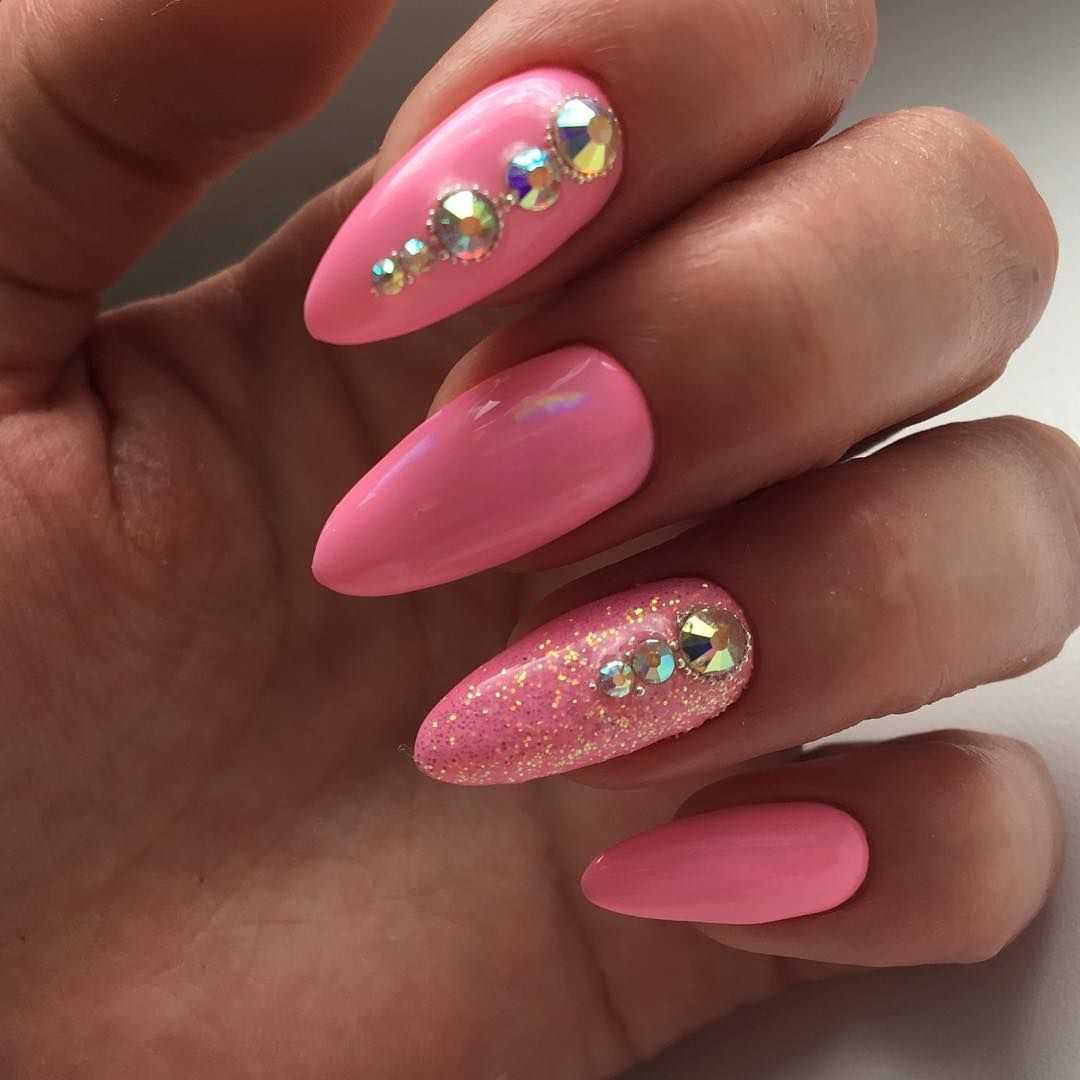 В тренде однотонный нежно-розовый маникюр, градиентный маникюр с белым цветом или другими оттенками розового. Что касается стразов, то их располагают в прикорневой зоне, выполняют полоску из стразов посередине ногтя, выделяют ими листочки и бутоны цветов. Сфера применения стразов в розовом маникюре по-настоящему безгранична. Стразы используют для инкрустации, эффектного декора с блестками и пайетками. На розовом фоне шикарно смотрится дизайн с “икринками”.