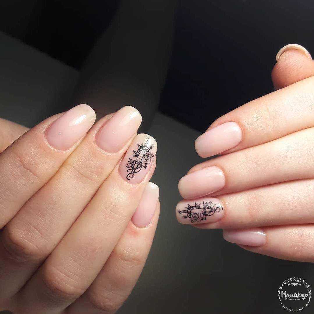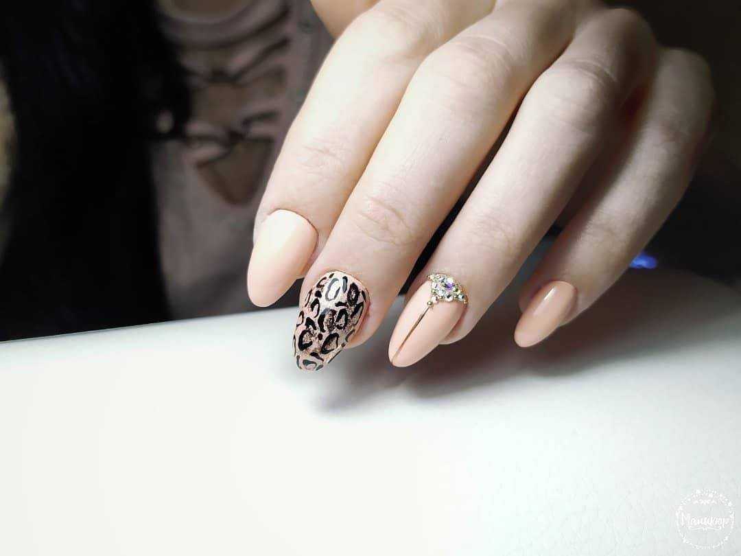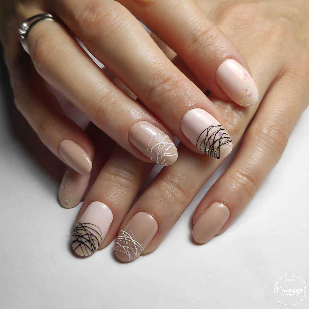 Так как бежевый цвет прекрасно сочетается с различными цветами, то можно выполнять рисунки любого понравившегося тона. Не менее оригинальным решением стали и элегантные кружевные мотивы белого или черного цвета. Для скромного и умеренного маникюра можно использовать рисунки в стиле минимализм, которые не перегрузят дизайн и немного разнообразят его. Без сомнения, можно наносить на ноготки различные анималистические принты, геометрические фигуры или нежные узоры.