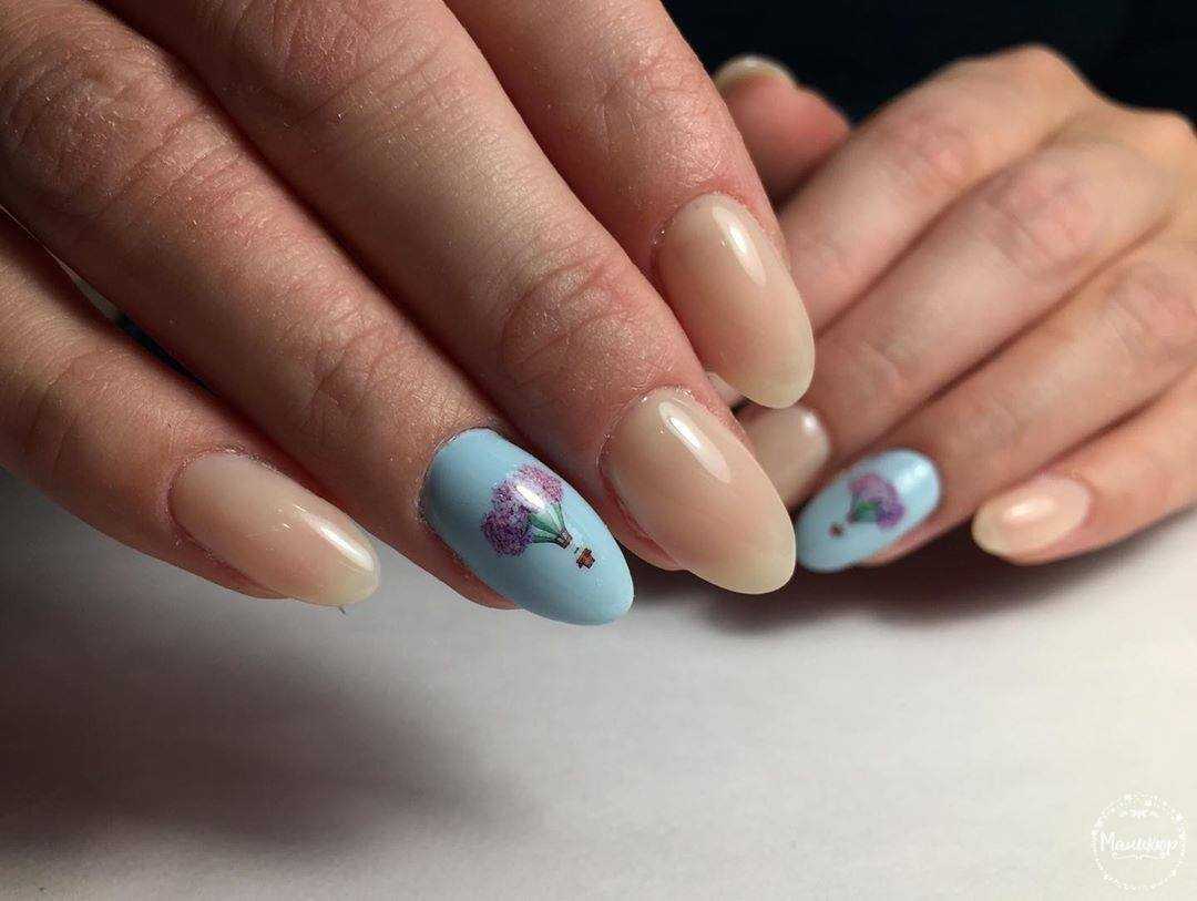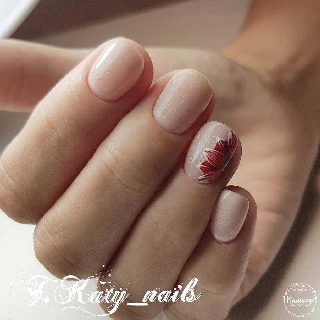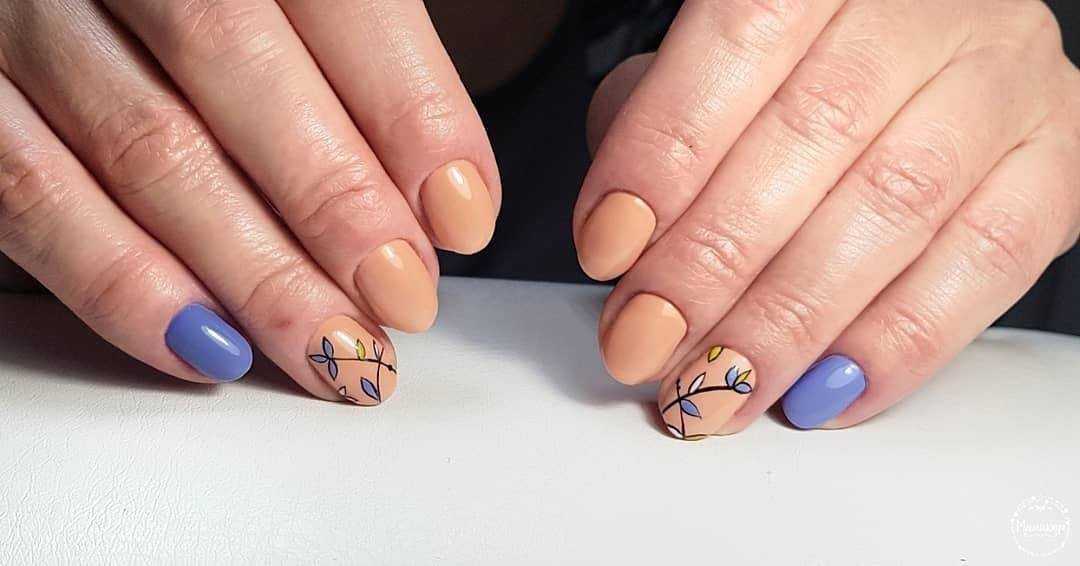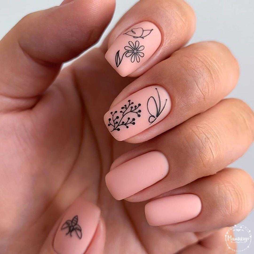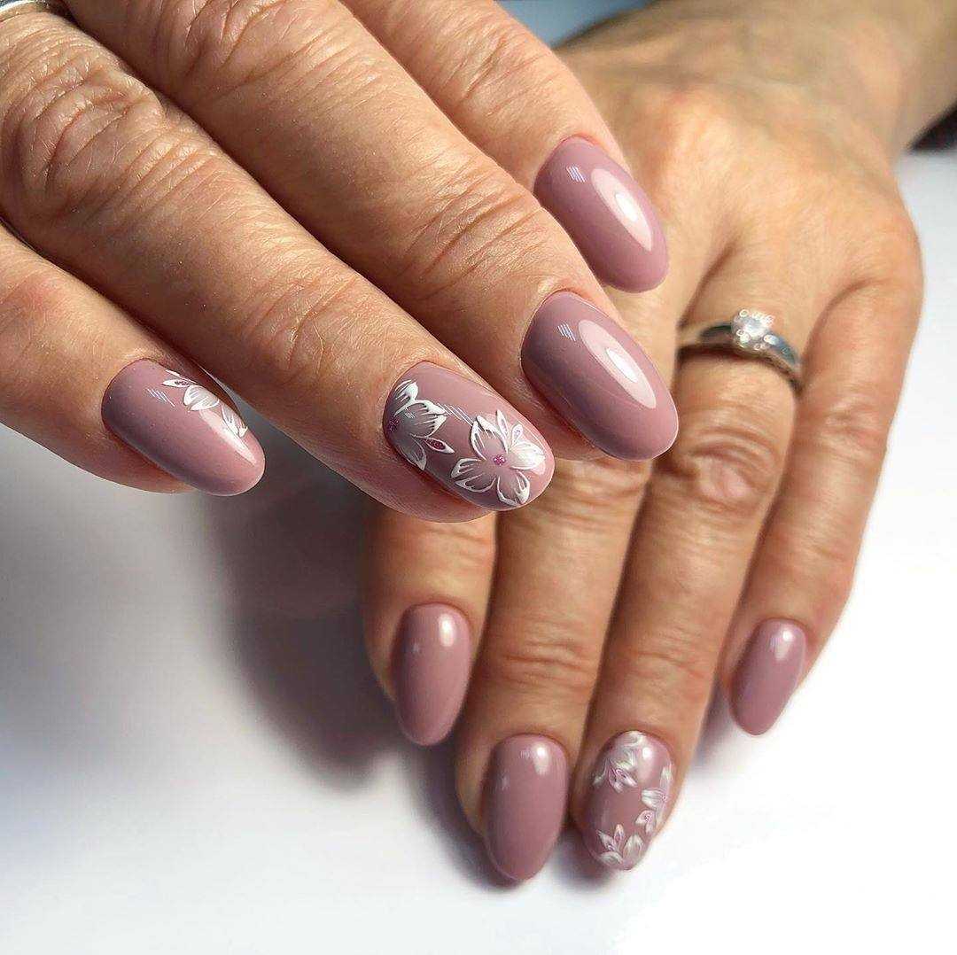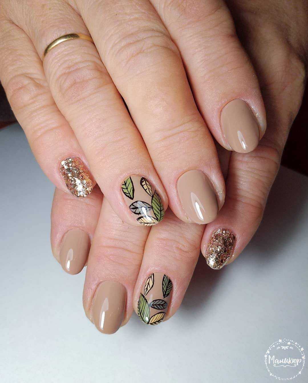 Для того, чтоб сделать бежевый маникюр более изящным и привлекательным, нужно использовать самые популярные и привлекательные узоры. Наиболее удачным вариантом считаются флористические мотивы. Они выполняются при помощи стемпинга, наклеек или в технике акварель.