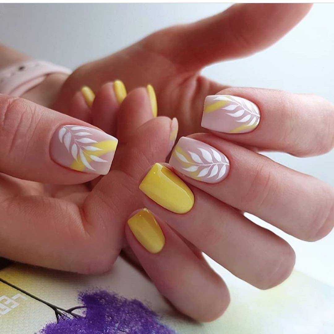 Натурально смотрятся бархатцы, окрашенные в мятный и желтый цвета. Для придания выразительности в уголке любого пальца можно расположить узор из цветных страз.