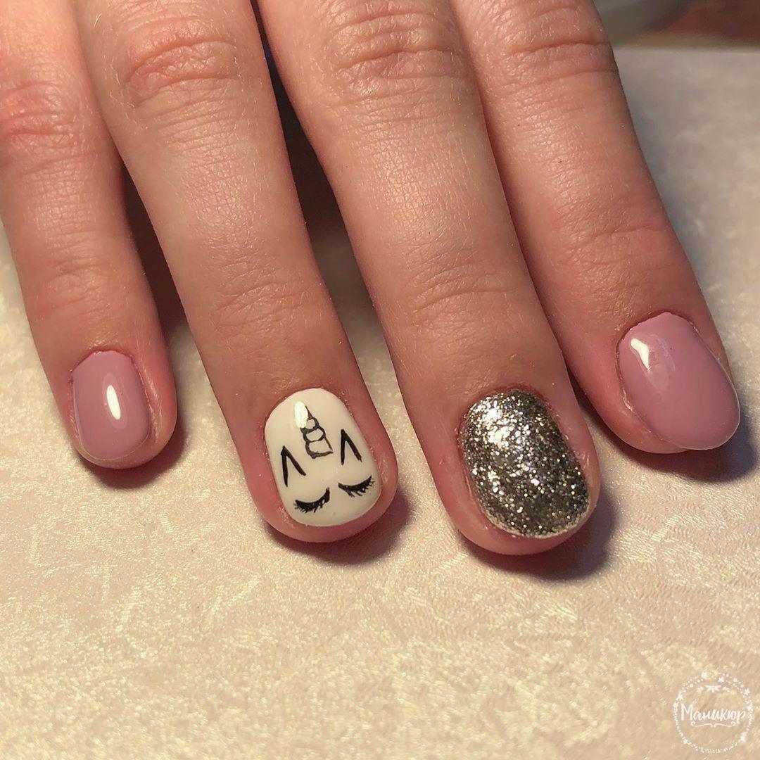 Вариант расположения одиночных украшений на каждом ногте в стиле минимализм можно назвать беспроигрышным вариантом для короткой длины. Не менее интересно смотрится полное выделение безымянного пальца сверкающим декором, а также вертикальные узоры в виде волны или завитка на паре ноготков.