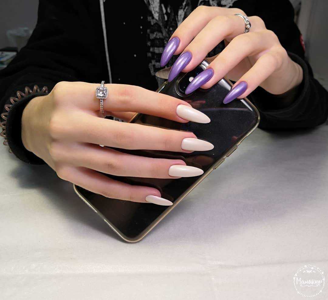 Если ногти длинные, допускается объединение разных видов техники, как то французского и лунного с дополнением небольшого количества камешков.