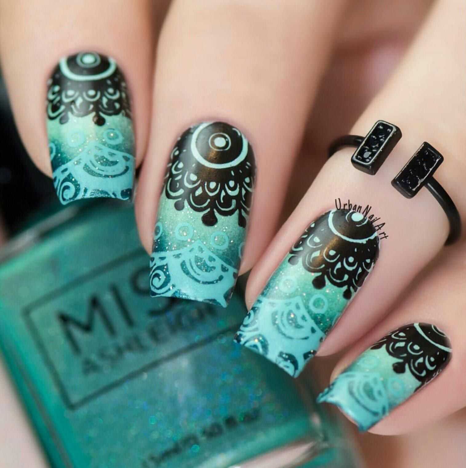 Особенно интересно выглядит кружевное оформление в черно-бирюзовом цвете. При этом можно использовать любой цвет в качестве прорисовки узора. Дополните такой дизайн черными мелкими стразами для окантовки узора, используйте вместо кружева узоры мехенди. Такой дизайн существенно отличается от классических пастельных нейл-артов, в большей степени благодаря контрастности и оригинальности узора.
