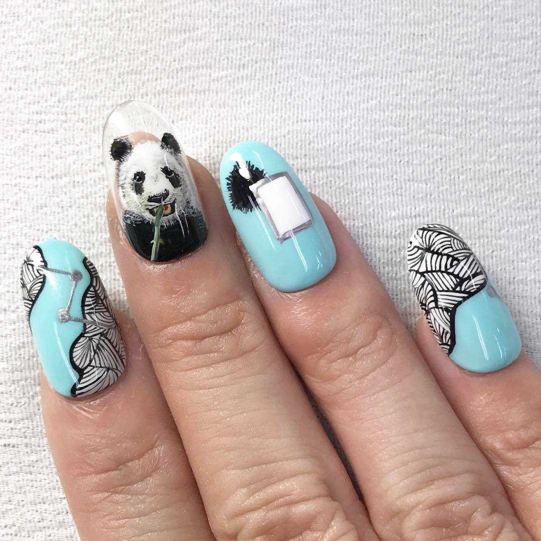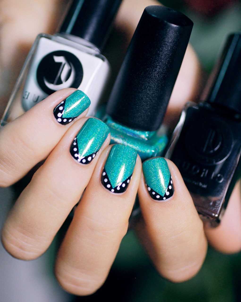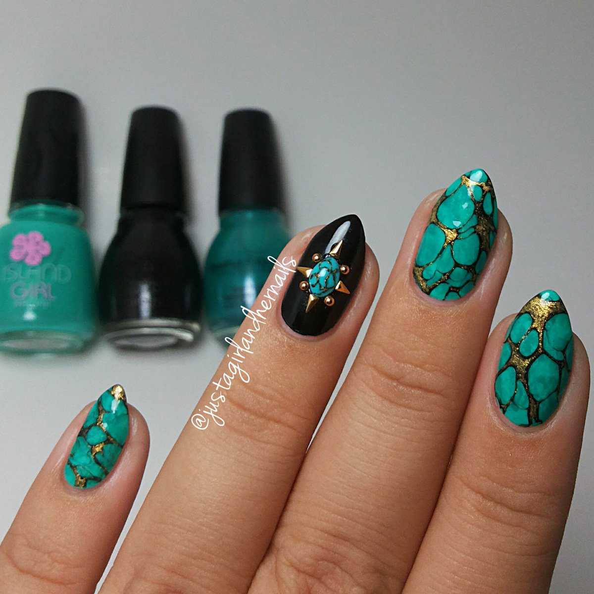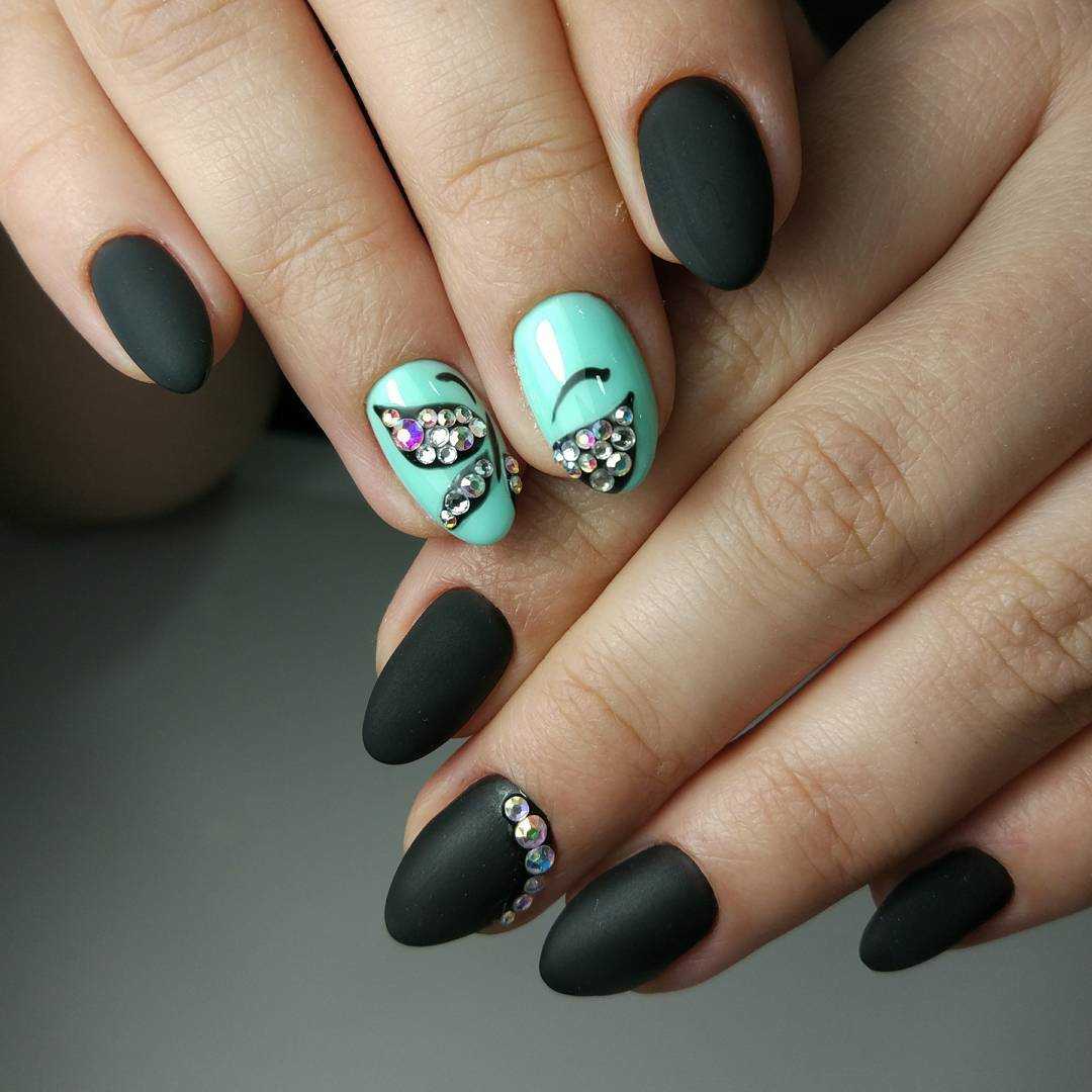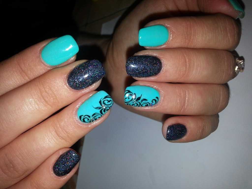 Идей черно-бирюзового маникюра огромное количество. Это могут быть аккуратные полоски черным цветом на бирюзовом фоне, отпечатка бирюзовой фольгой на черном фоне, рисунки-оригами в черном цвете на бирюзовом ноготке.