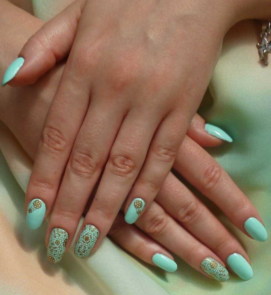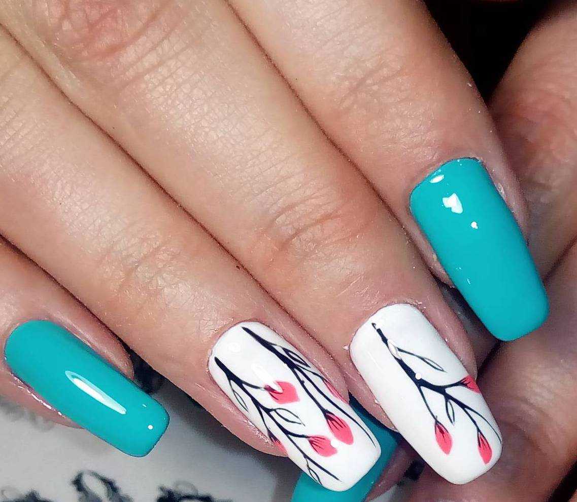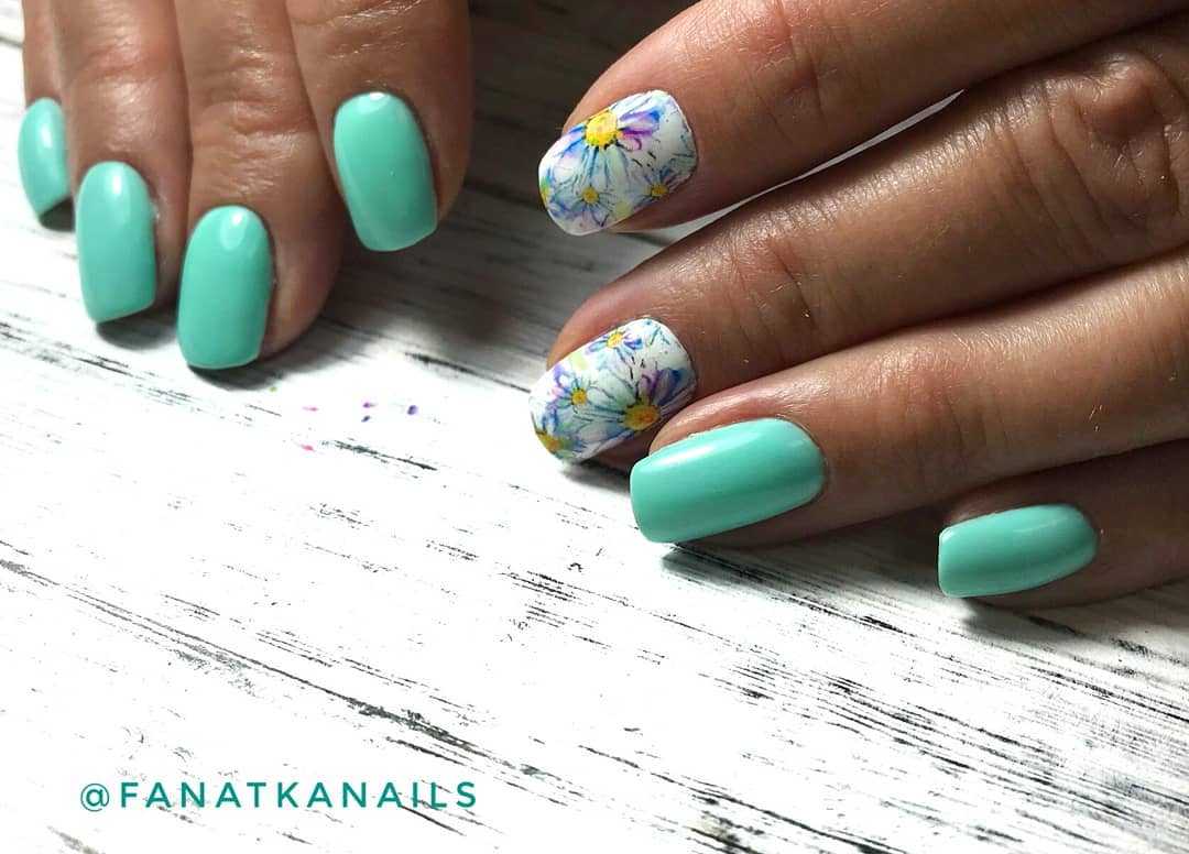 Нежный бирюзовый цвет ассоциируется с весенней прохладой и полевыми цветами, поэтому лучшим дополнением маникюра станет цветочный орнамент. Флористическая тема уже продолжительное время занимает лидирующие позиции среди всех способов украшения ноготков. Это неудивительно, ведь большое разнообразие цветов позволяет создать сотни уникальных, ярких и оригинальных нейл-артов.