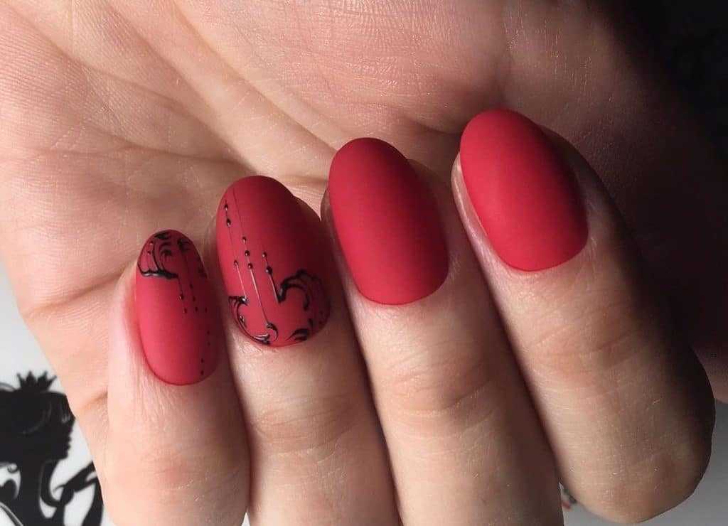 Вторым по-популярности, в этом сезоне является красный маникюр с различными рисунками. Это самое востребованное и желанное сочетание — вне моды и времени. Как мы знаем, красные ноготки любит большая часть прекрасной половины человечества, и рисунки на ноготках предпочитает не меньшее их количество.