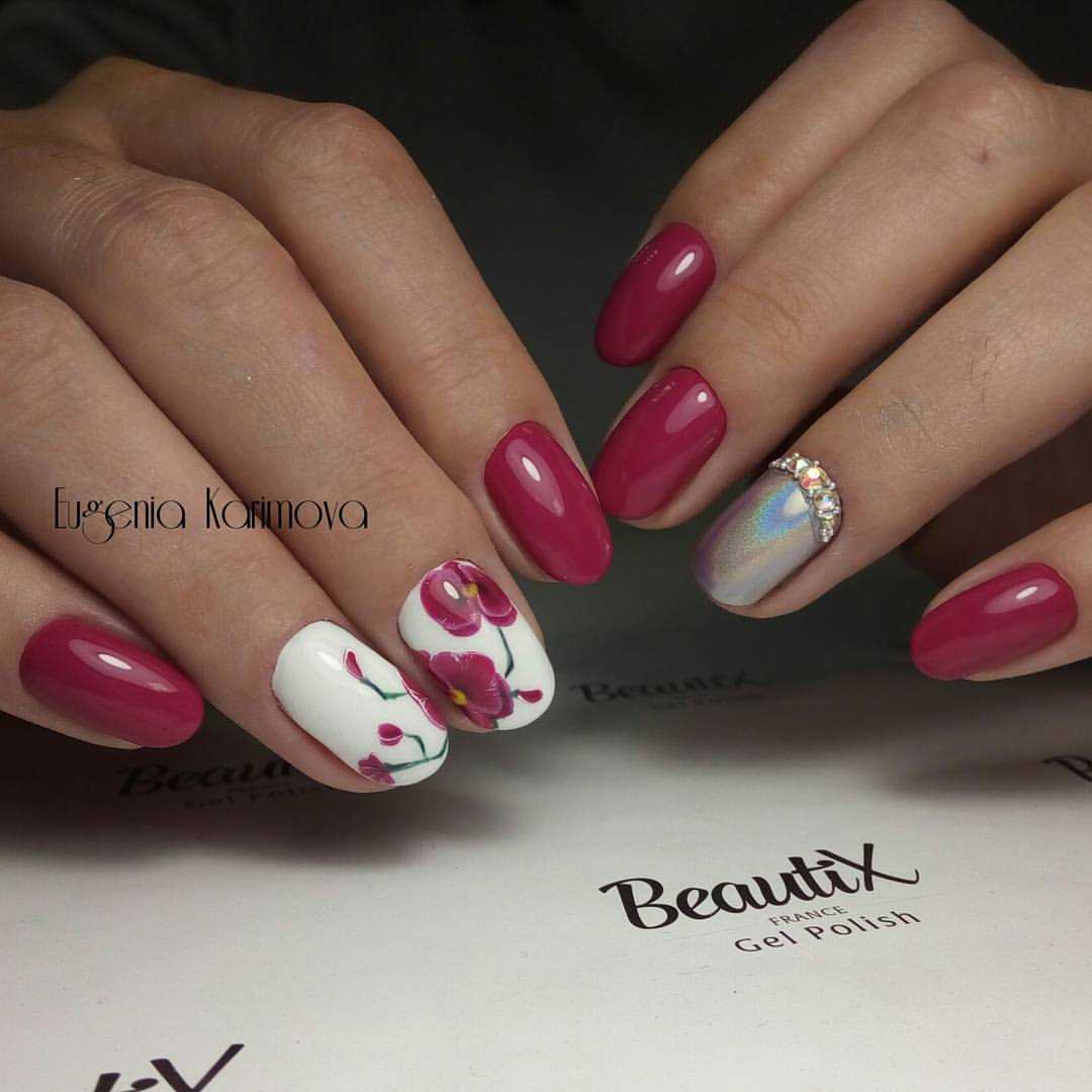 Среди романтичных натур популярны рисунки цветов, сердечек и бабочек. Лучше всего такие рисунки смотрятся на белой, молочной или нюдового цвета основе. Очень элегантно и романтично смотрятся рисунки роз, тюльпанов, маков и различных других красивых цветов.