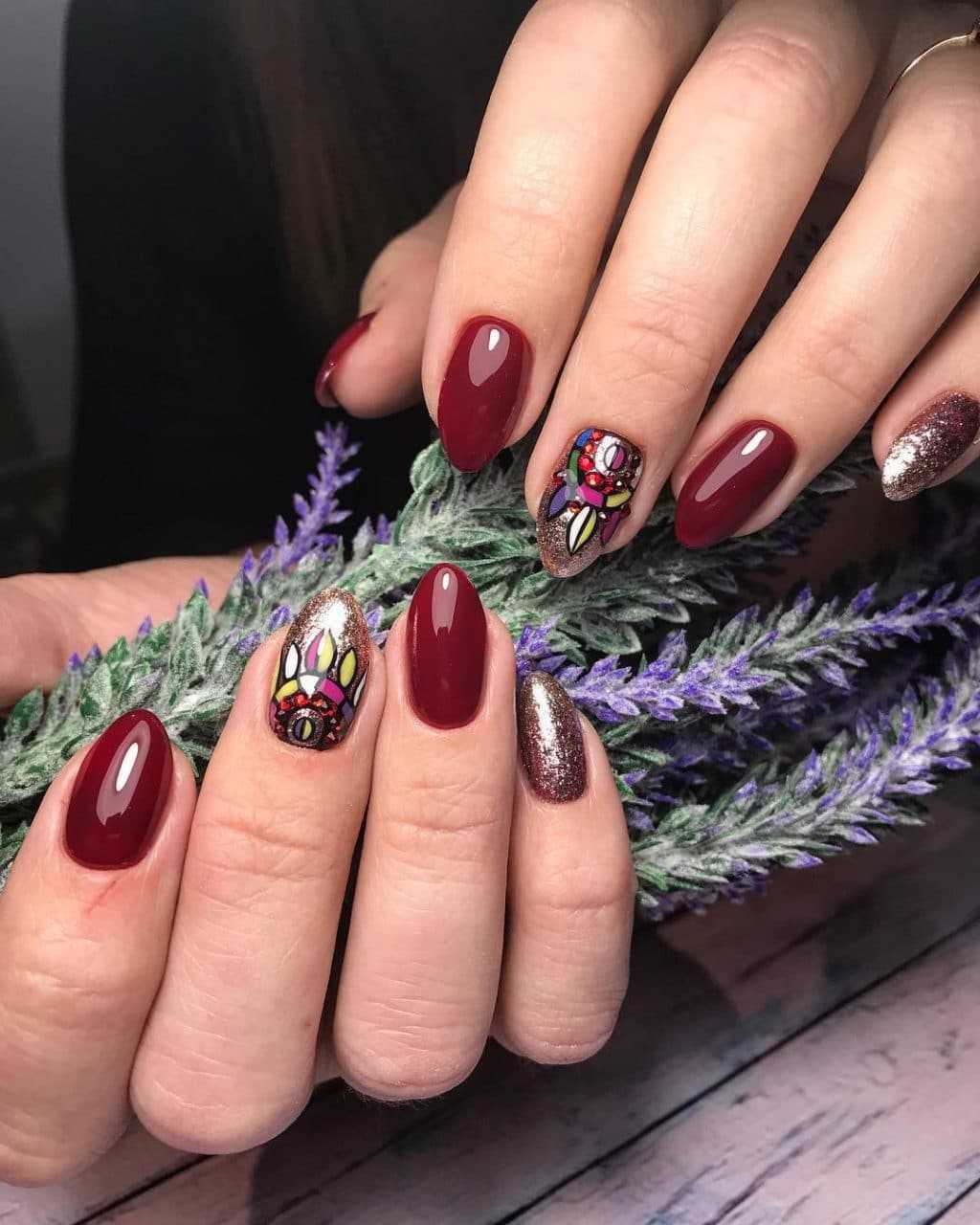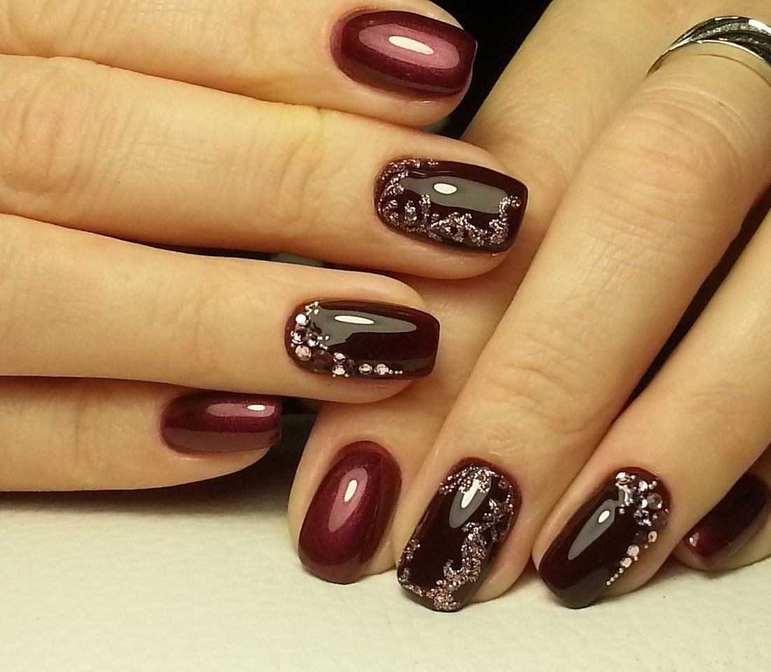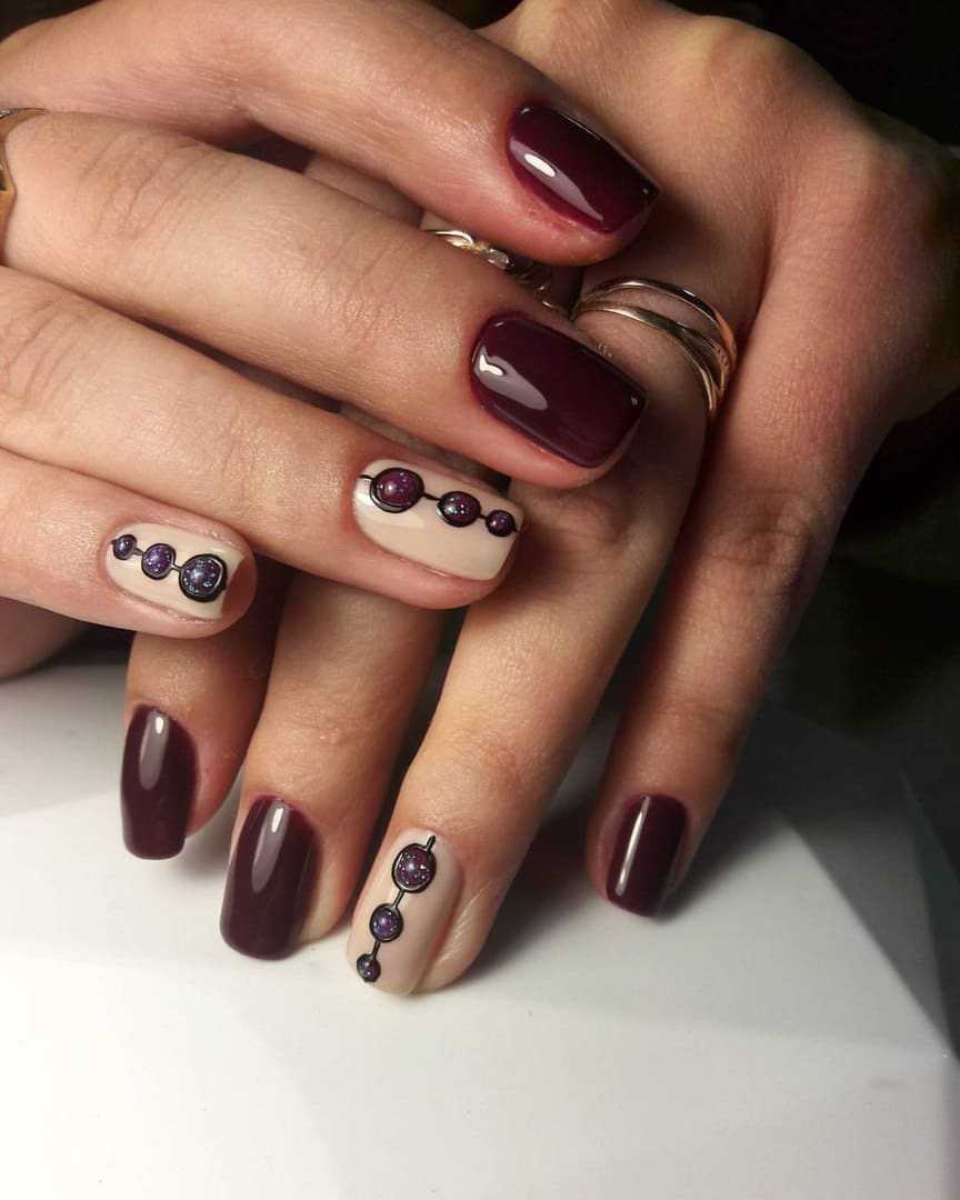 Дизайн может быть совершенно разным – от покрытия другим цветом лишь одной ногтевой пластины до рисунков на фоне сливового оттенка. Изобилие всевозможных вариантов поможет вам подобрать наиболее близкий для себя.