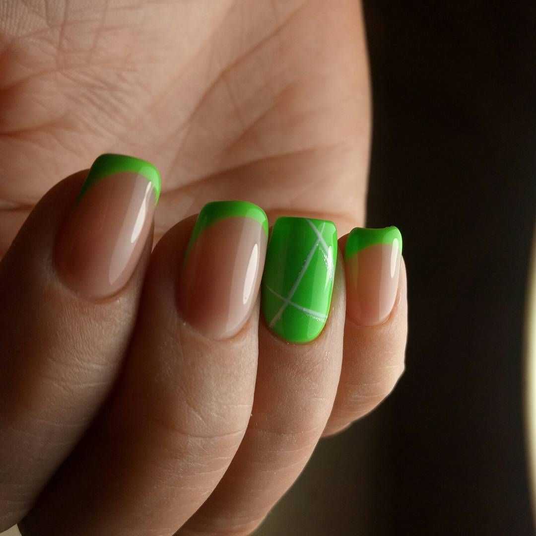 Как показывает практика, с приглушенным нюдовым фоном отлично комбинируются ярко-розовые, салатовые, оранжевые или желтые акценты. Можно ограничиться прямыми или хаотичными линиями, выполненными с помощью яркого лака. Но если добавить вкрапления модного узора «перепелиное яйцо» и матовый топ, маникюр сразу же станет ультратрендовым.