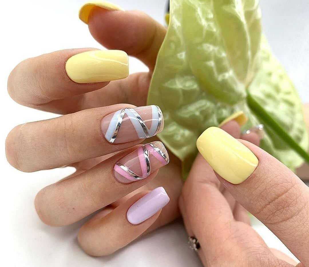 Ярким вариантом маникюра на квадратные ногти станет желтый, красный или розовый дизайн в стиле негативного пространства. Непрокрашенные участки придадут квадратным ноготкам утонченности и свежести.