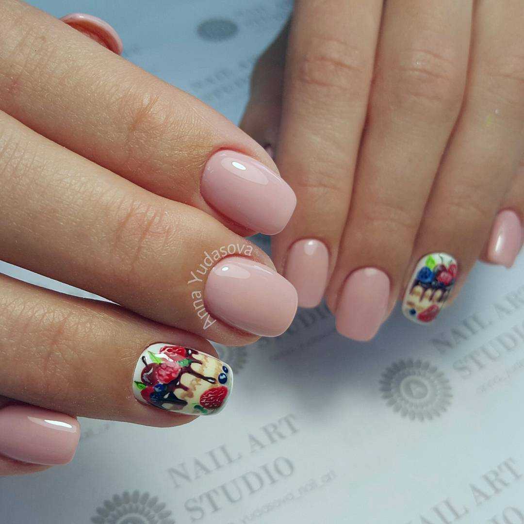 Это могут быть фруктовые или тематические летние зарисовки. С блестками или небольшим количеством страз такой маникюр смотрится максимально выигрышно.