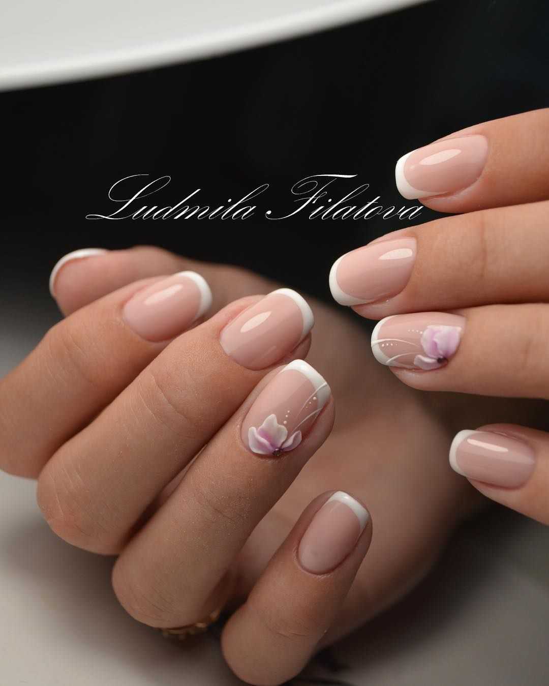 Классический френч, выполненный с использованием розового цвета для фона и белого для окрашивания свободного края ногтевой пластины, также отлично дополнит квадратную форму ногтей. Чтобы сделать его более интересным, можно добавить небольшой цветочный рисунок белого цвета на ноготь безымянного пальца. Одиночный страз, добавленный в середину цветка, станет акцентом этой идеи.