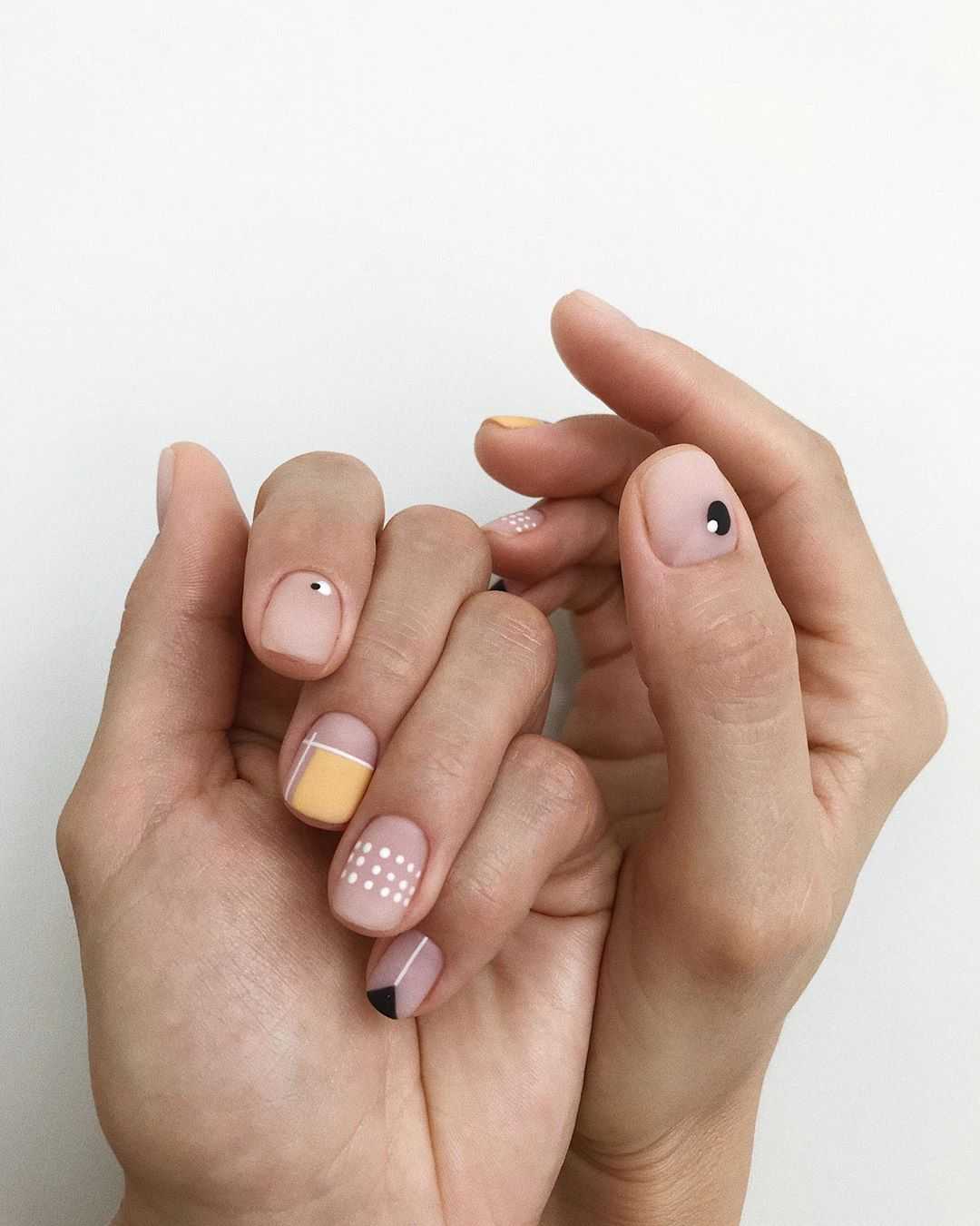 Несмотря на невероятную популярность геометрии, как стиля дизайна в нейл-арте, он также со временем меняется. Появляется все больше вариаций, благодаря которым маникюр смотрится по-разному. Кто-то предпочитает сдержанную лаконичность. Для этого лучше выбирать нюдовые оттенки даже в летнем сезоне. Непосредственно рисунок в основном содержит не много деталей всего на нескольких ноготках.