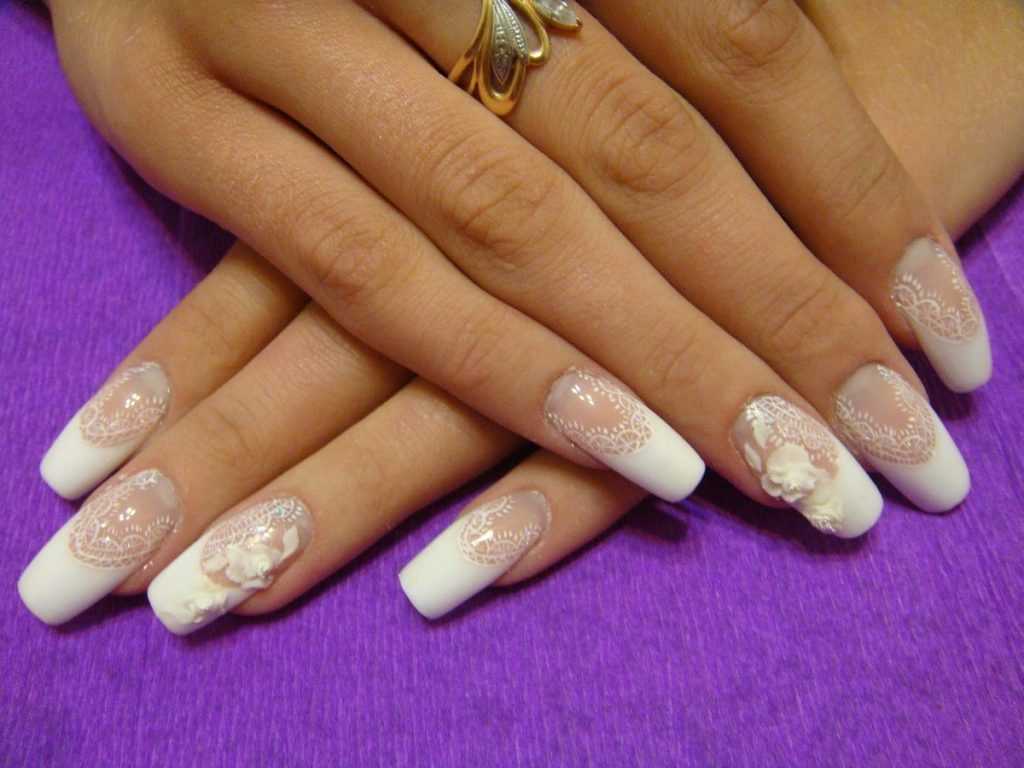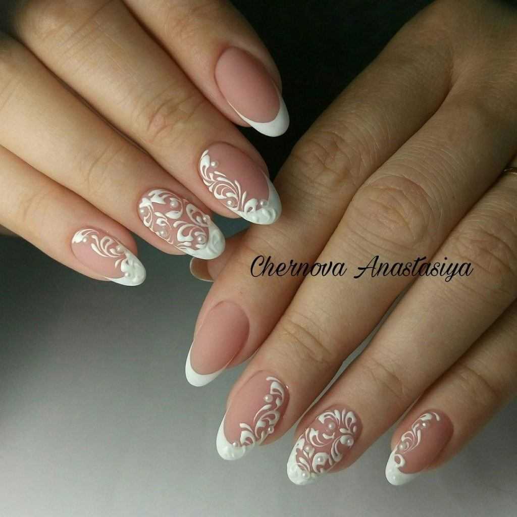 Невесты всегда выбирают нежный и красивый маникюр. Ведь все знают, что это будет видно на фото и видео. Поэтому выбор маникюра с кружевом — отличный вариант. Такой дизайн обычно выполняется в светлых тонах. И чаще всего сочетается с французским маникюром.Для красивого эффекта мерцания можно добавить стразы. Они дополнят маникюр и добавят солнечных бликов.