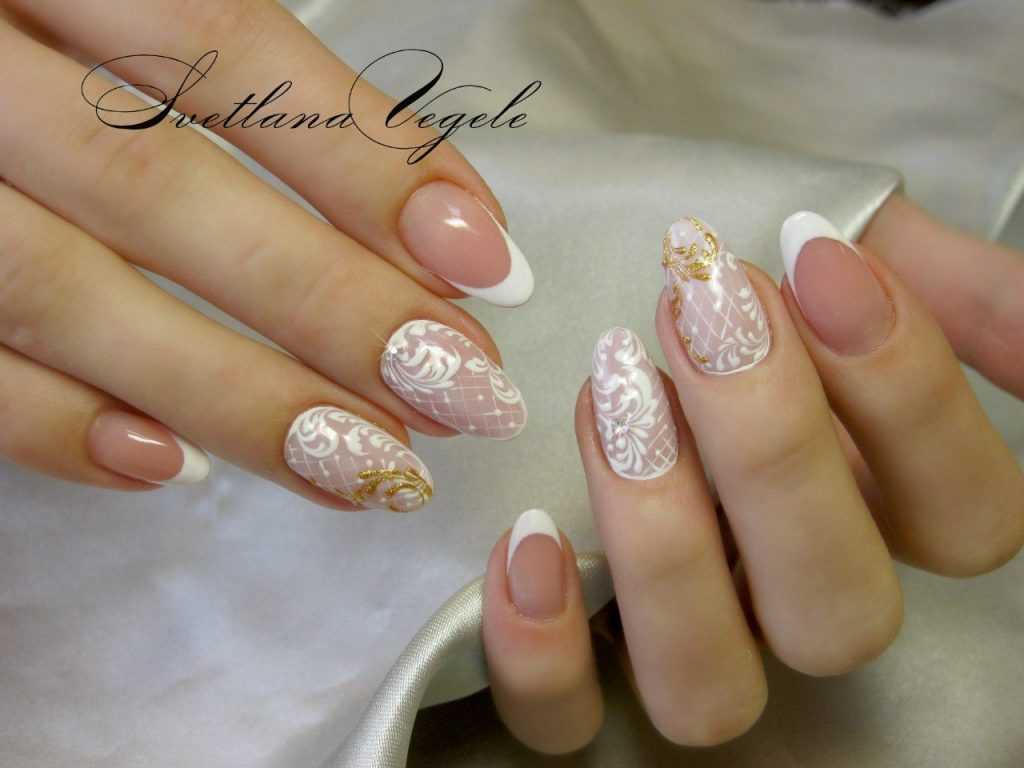 Кружевной маникюр отлично сочетается с классическим френчем. Он смотрится нежно и торжественно, поэтому такой дизайн часто выбирают невесты, хотя в повседневных условиях он будет уместен. Вы можете украсить кружевом все ноготки или выделить им акцентированные.