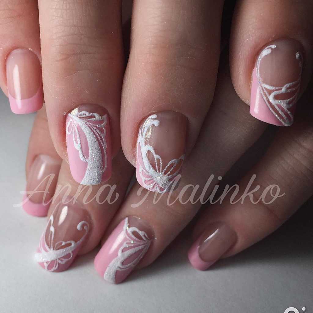 Можно смело обращать внимание на косой френч, лунный маникюр и даже перевернутый. В некоторых вариантах вместо стандартного выделения зоны улыбки белой полосой используйте сам ажурный узор