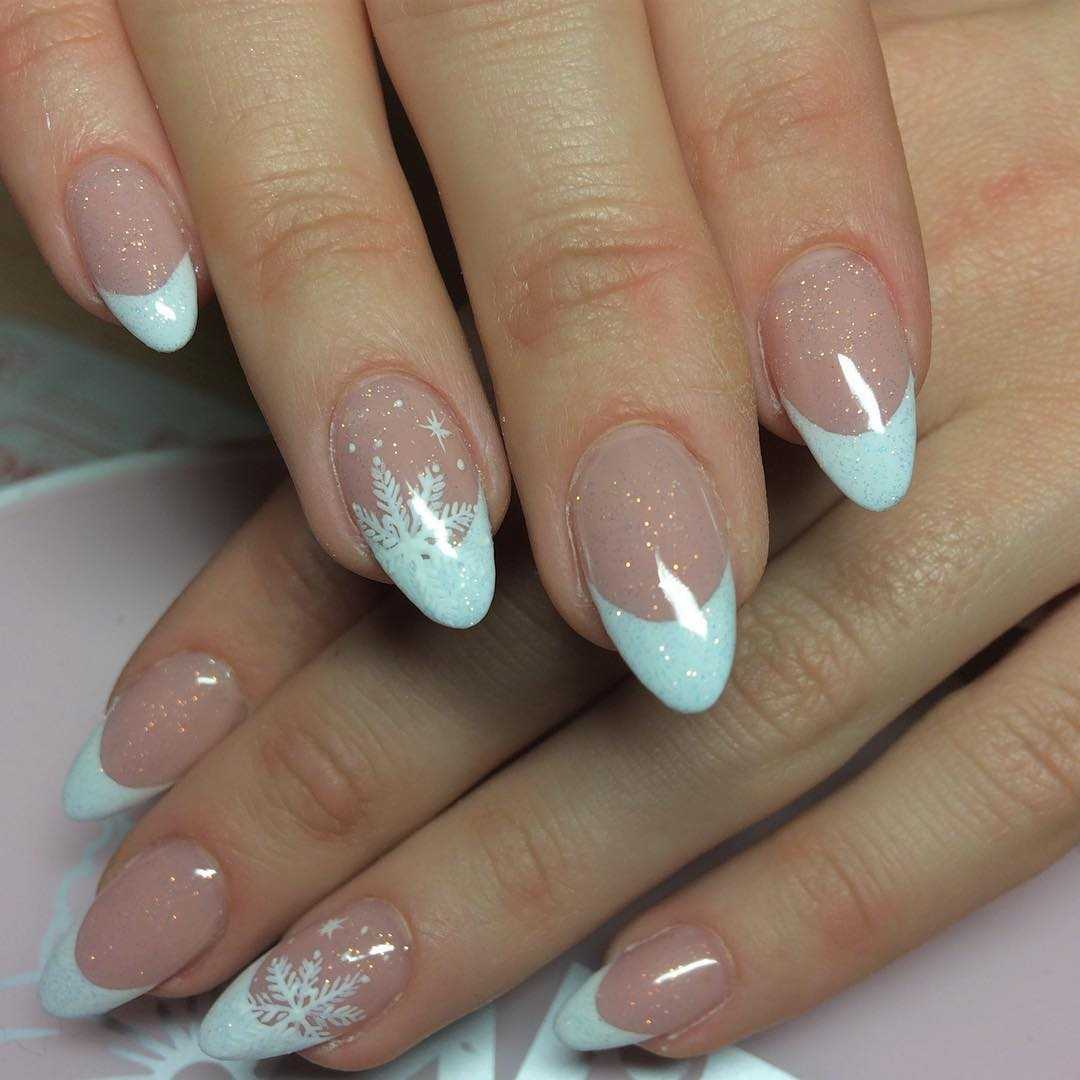 В новогоднем маникюре можно нарисовать объемные снежинки гелем или акрилом. Если вы новичок, нарисуйте маленькие белые точки. Мастера могут создать трехмерное изображение Деда Мороза, северного оленя и других праздничных атрибутов.